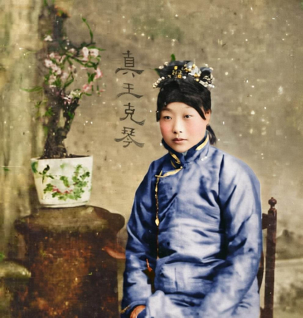这张照片是清末民初著名京剧名伶王克琴的留影,拍摄于1910年,当时王克琴年仅16岁,已出落得亭亭玉立。她身着华丽的缎面袄裙,头戴精致的珠翠头饰,端坐在布景前,尽显名伶的风华,这张照片由法国驻华武官菲尔曼·拉里贝拍摄。 王克琴自幼学习京剧,专攻花旦,十二三岁便正式登台,因扮相秀丽、唱腔婉转,在天津、上海、武汉等地名噪一时,是当时“第一代梨园女伶”中的佼佼者,月包银高达千金,在天津坤伶中无人能及。 她的美貌与才艺引来了各路军阀的觊觎。湖北都督段芝贵曾想纳她为妾,因段夫人强烈反对而作罢,此事曾轰动一时。后来,“辫帅”张勋以一万二千银元的重金将她娶回,成为其三姨太。 在张勋府中,她虽锦衣玉食,却毫无自由,还饱受张勋怪癖的折磨。最终,她与张勋的一名随从私奔,成功逃离了张府,这在当时也成了轰动全国的大新闻。 离开张勋后,她试图重返舞台,但风光不再,加上吸食鸦片损害了健康,最终在贫病交加中于1925年在上海病逝,年仅31岁(一说35岁)。