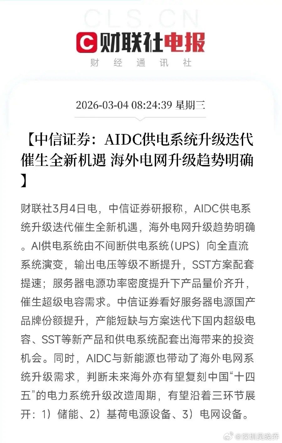 中信证券的研报点出了一个新方向——AI不只是算力,还要电力,还要供电系统。服务器电源、超级电容、SST这些细分领域,可能成为下一个资金追捧的赛道。海外电网升级是长逻辑,不是炒一天两天。