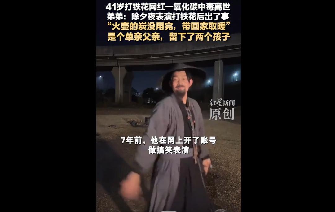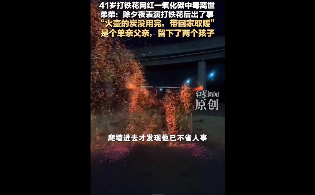 山东菏泽 41 岁打铁花网红 “村夫”,系两名女儿的单亲爸爸,为生计辗转多职,去年自学打铁花等表演,日子刚有起色。 除夕夜,他将表演剩余炭火带回家取暖,因一氧化碳中毒离世,弟弟次日发现时已不省人事,送医抢救无效。 这个春节,许多人记住了 “村夫” 挥臂打出的漫天火花,却没想到,这份点亮夜色的炽热,最终竟与一场冰冷的意外相连。 当 “日子刚有好转,人却没了” 的叹息传来,我们看见的,不仅是一个生命的猝然凋零,更是一份底层生活的坚韧与无奈。 “村夫” 的人生轨迹,是无数平凡奋斗者的缩影。 作为单亲爸爸,他搬砖、送外卖、干代驾,在体力与生计的夹缝中辗转;7 年试水短视频,从搞笑表演到自学打铁花,不过是为了抓住流量的风口,给两个女儿挣一份更安稳的未来。 他的节俭从不是吝啬,而是长期生活磨砺出的本能 —— 不忍浪费的炭火,是他对生活的珍惜,却也成了夺走生命的隐患。 这份令人心碎的巧合,戳中了无数人的共情:为了家人,我们总在精打细算,却往往容易忽略,那些习以为常的生活细节,可能藏着致命的风险。 这场悲剧,更折射出底层群体安全防护的普遍短板。 一氧化碳无色无味,隐蔽性极强,而在 “村夫” 的租住屋中,既没有安装低成本的一氧化碳报警器,也未形成开窗通风的习惯。 对他而言,“安全” 或许是一个略显奢侈的词,比起安装报警器的几十块钱,女儿的学费、家里的柴米油盐显然更紧迫。 这种现实的取舍,让我们看到,安全意识的普及,从来不是一句简单的 “注意防范”,更需要兼顾底层群体的经济承受力与认知盲区。 愿 “村夫” 打出的最后一场火花,能照亮更多人对安全的重视;愿他的两个女儿,能在亲人的照料下,健康长大。41岁打铁花网红一氧化碳中毒去世 单亲爸爸打铁花成网红中毒离世