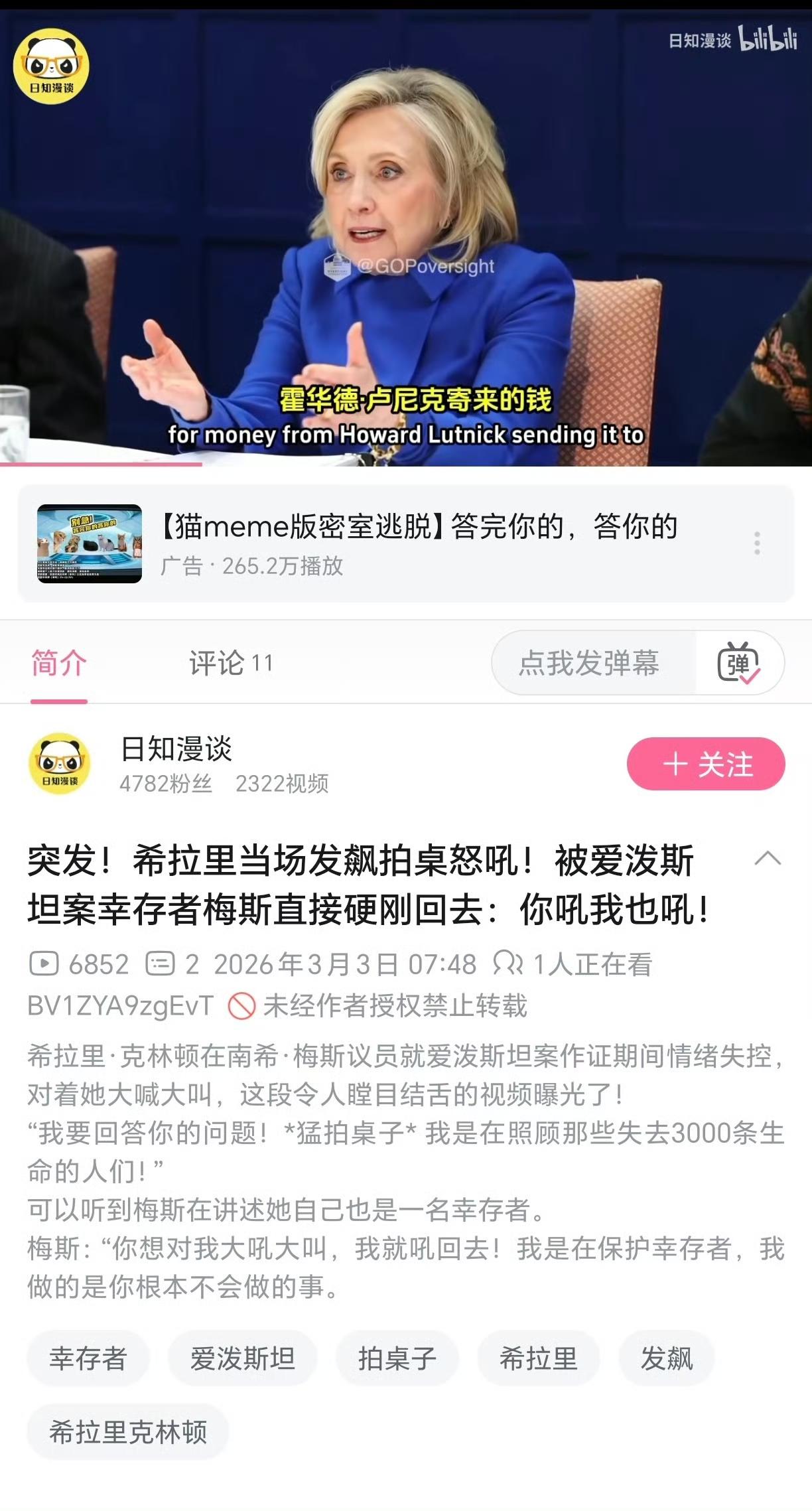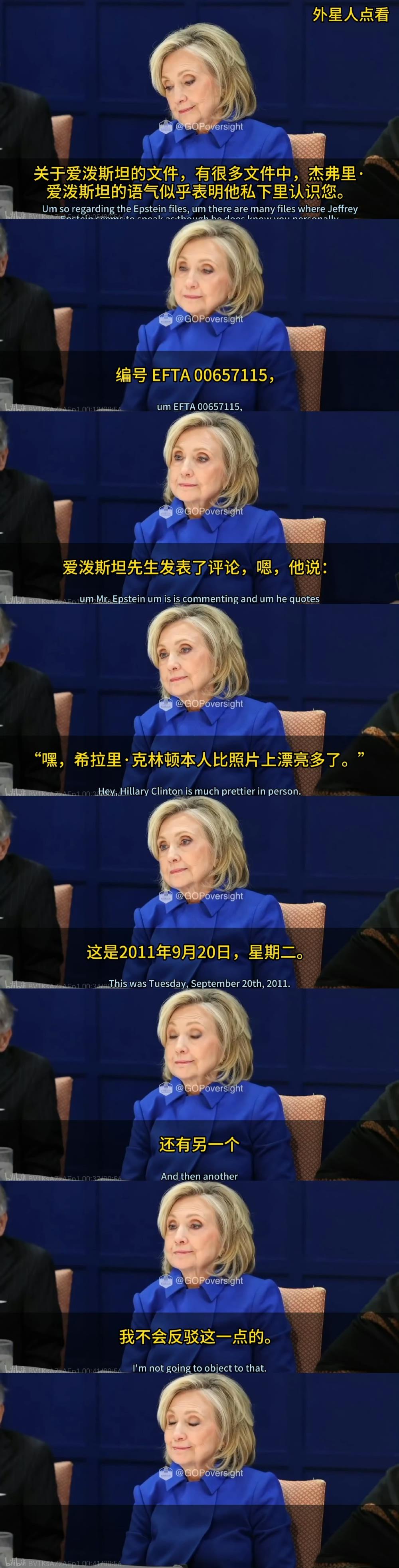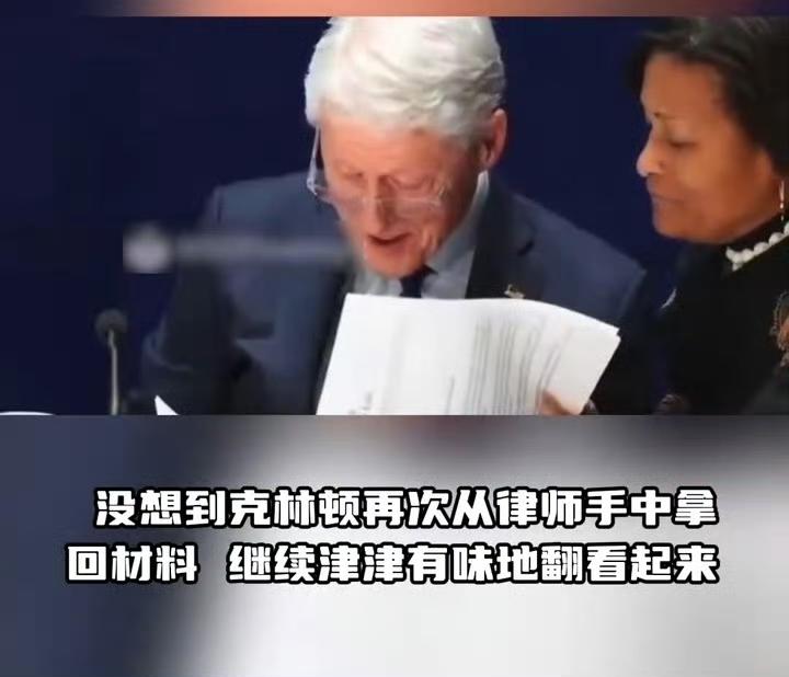 在中东战火的掩护下,克林顿夫妇正在接受爱泼斯坦案的听证。 克林顿翻看卷宗时一脸陶醉,似乎在回味曾经的欢乐时光。 希拉里更是得意地说:爱泼斯坦夸我真人比照片上更漂亮。 随着听证进行,夫妇俩各自都出现了情绪失控发飙。 希拉里发飙后怒吼受害者,克林顿发飙是维护特朗普,说特朗普在爱泼斯坦相关的事情中不存在任何错误。