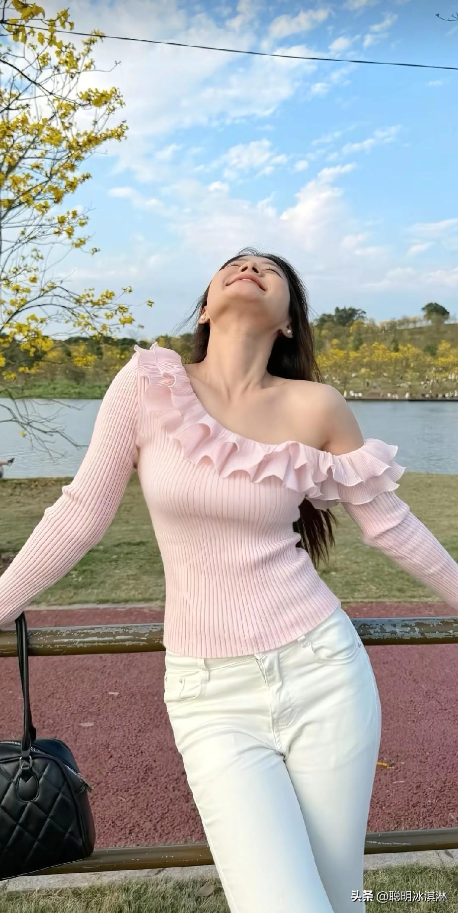 粉衣美人倚栏杆,笑语盈盈似画卷。