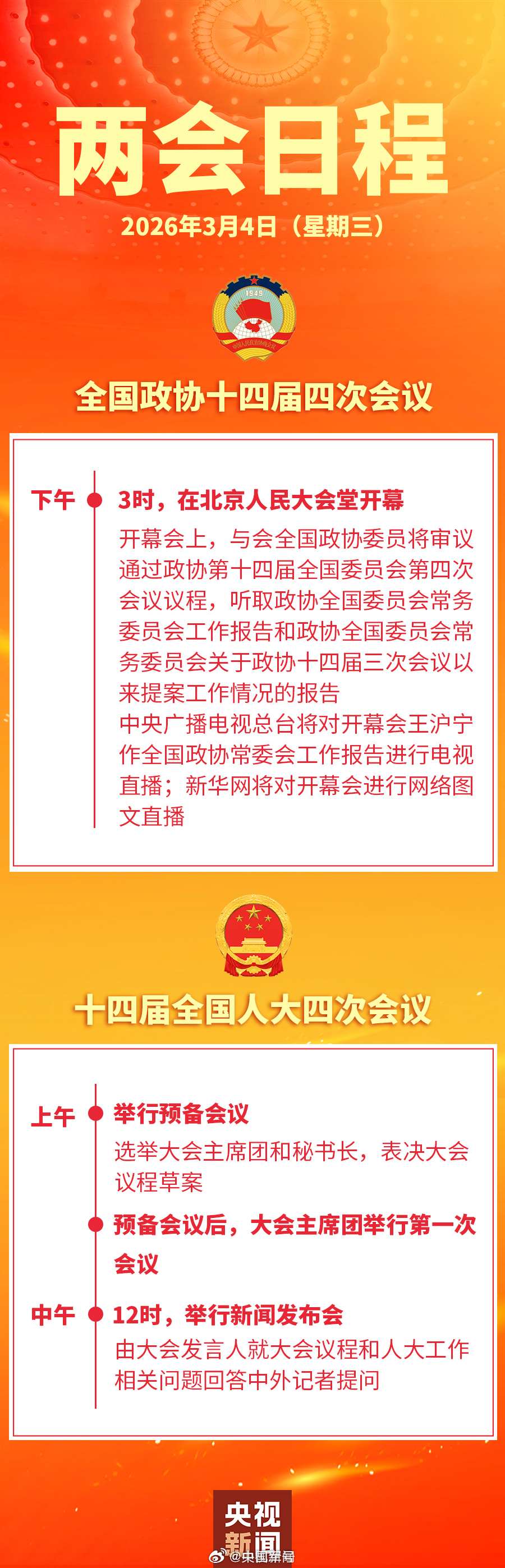 两会【3月4日两会日程】关注!今日12时,十四届全国人大四次会议发布会将举行。下午2时,第一场委员通道集体采访将举行。下午3时,全国政协十四届四次会议将在北京人民大会堂开幕。(央视新闻)