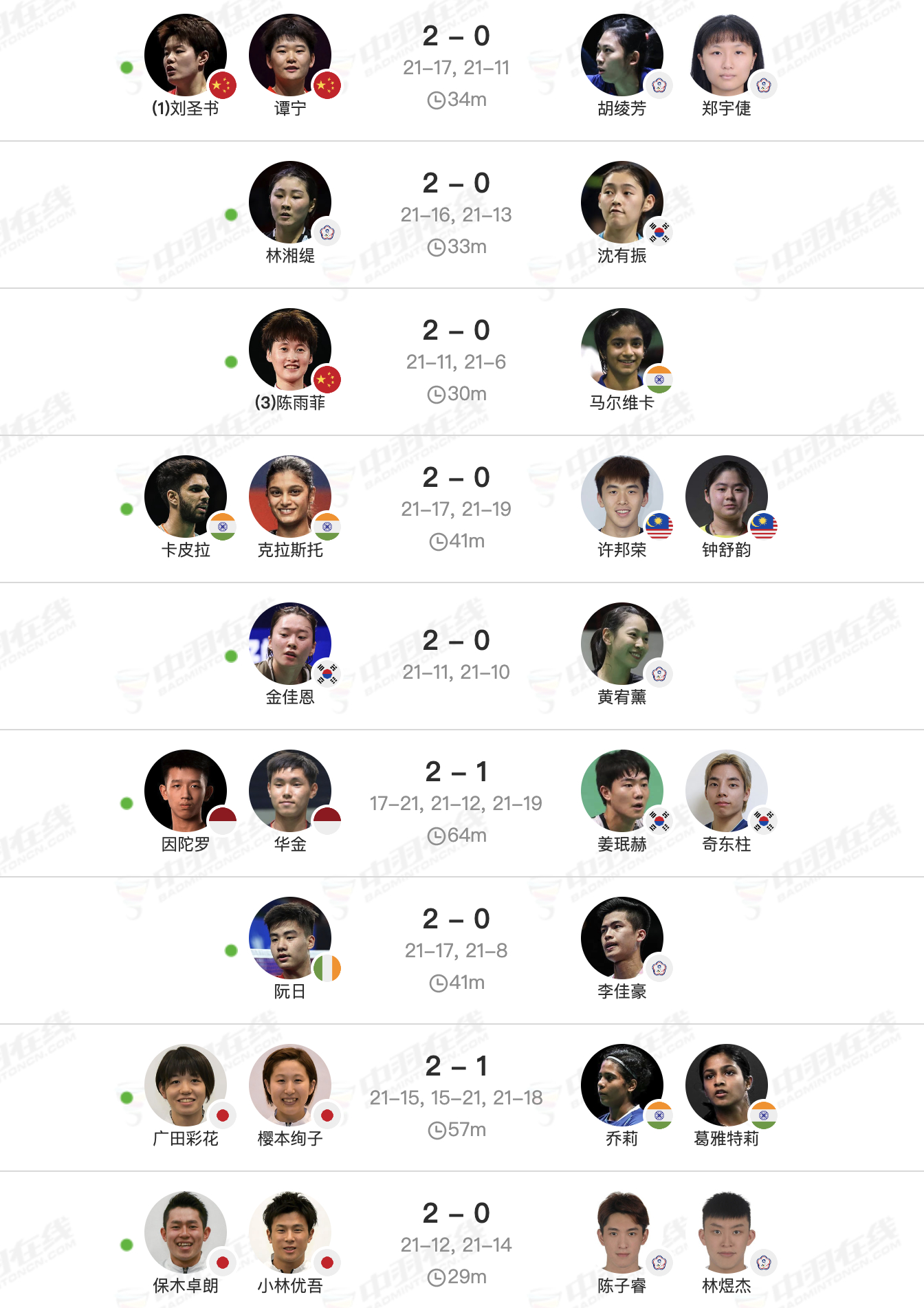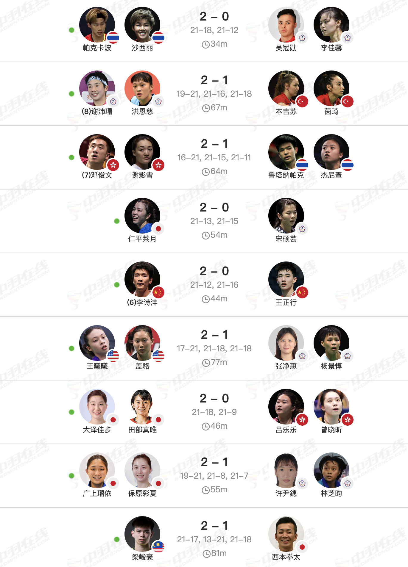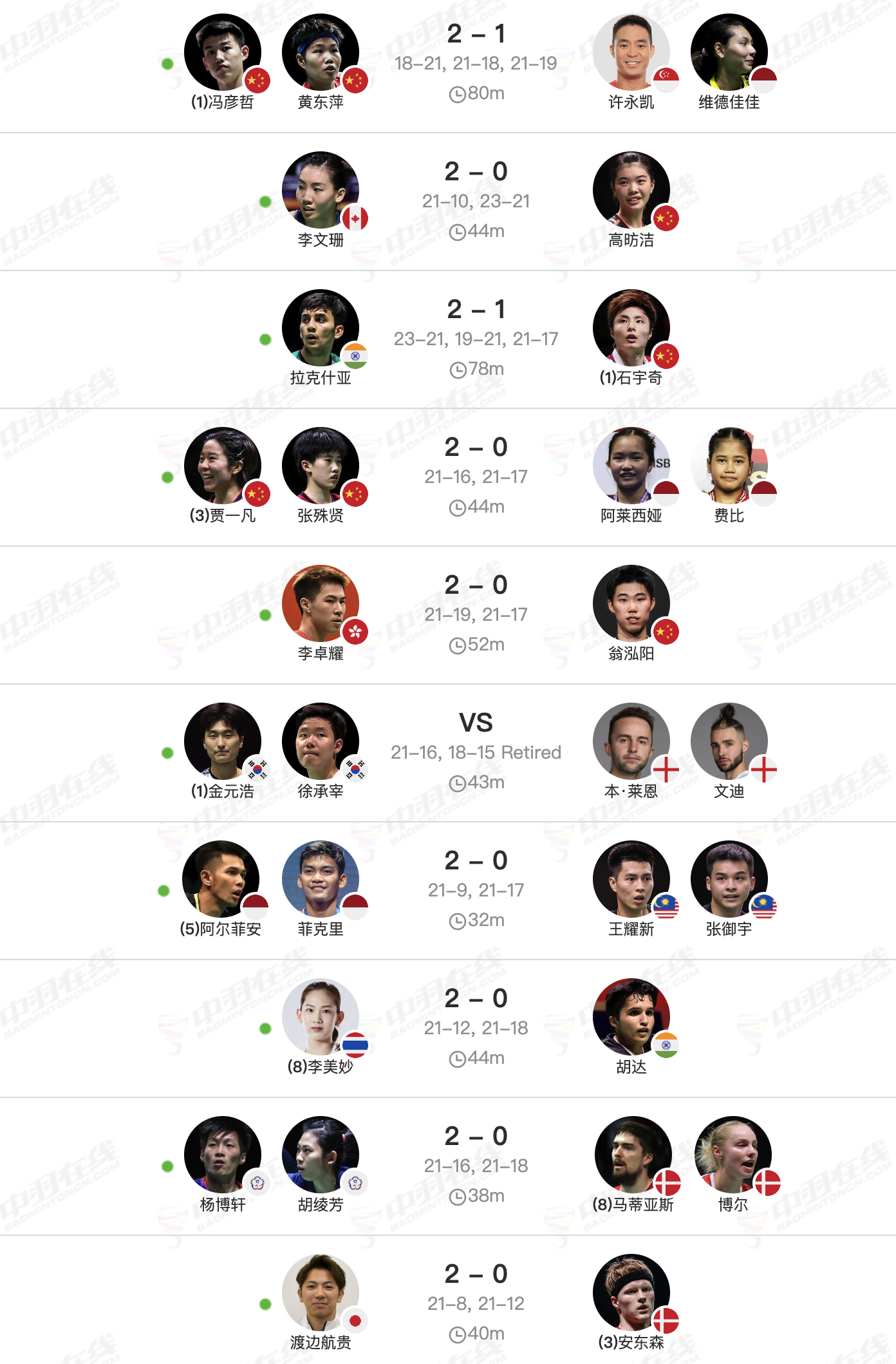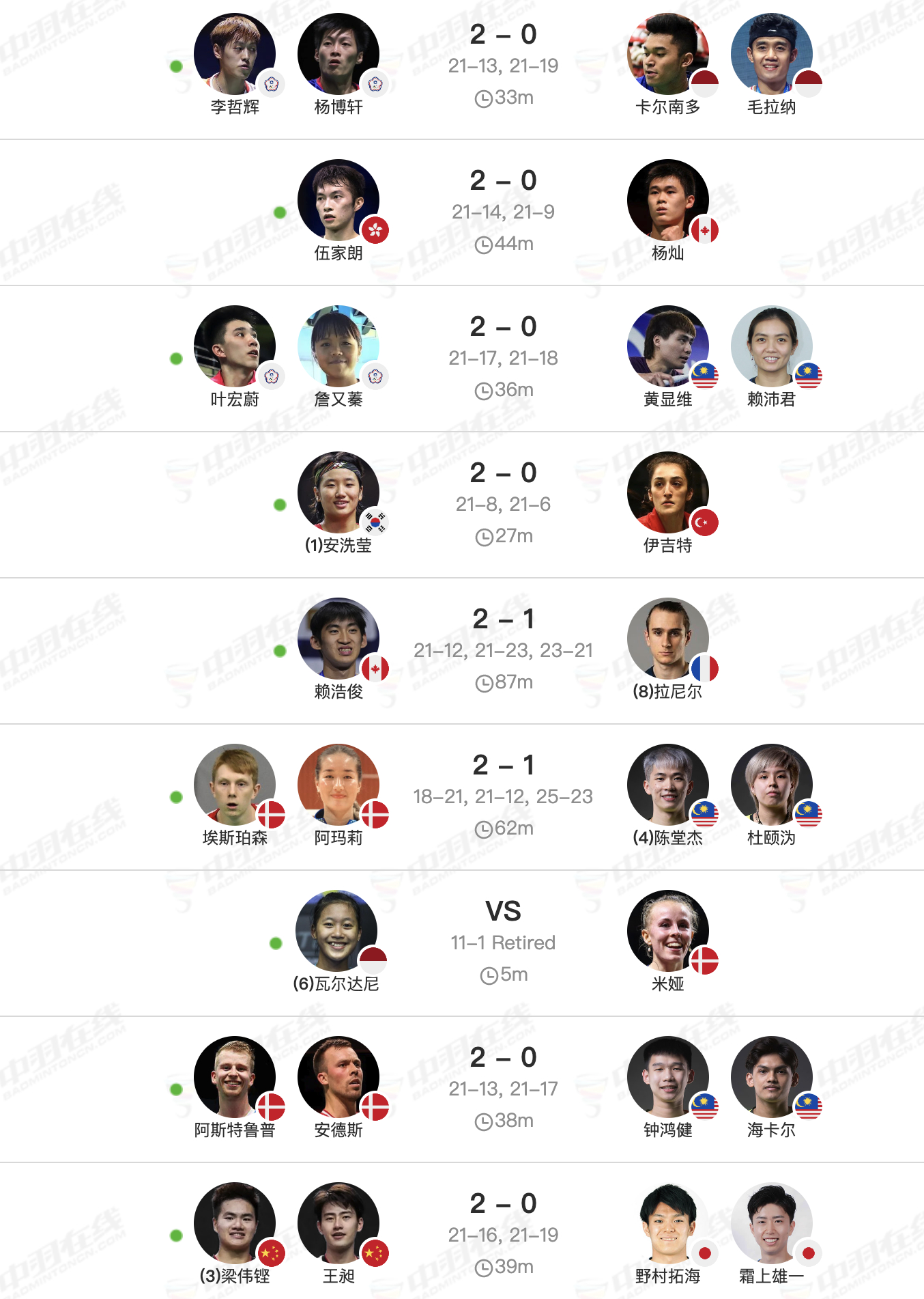 安东森🇩🇰0-2🇯🇵渡边航贵,安东森之前5连胜!石宇奇🇨🇳1-2🇮🇳拉克什亚,石宇奇之前4连胜!马蒂亚斯/博尔🇩🇰0-2杨博轩/胡绫芳,丹麦组合之前4连胜!拉尼尔🇫🇷1-2🇨🇦赖浩俊,双方首次交手!陈堂杰/杜依蔚🇲🇾1-2🇩🇰埃斯珀森/阿玛丽,双方首次交手!