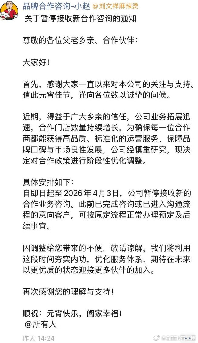 刘文祥麻辣烫暂停新合作受短视频博主“紫薯精”相关内容走红带动,刘文祥麻辣烫全国门店持续爆单,品牌方于3月2日发布公告,宣布即日起至4月3日暂停接收新加盟合作咨询,以保障现有门店运营与品牌良性发展。