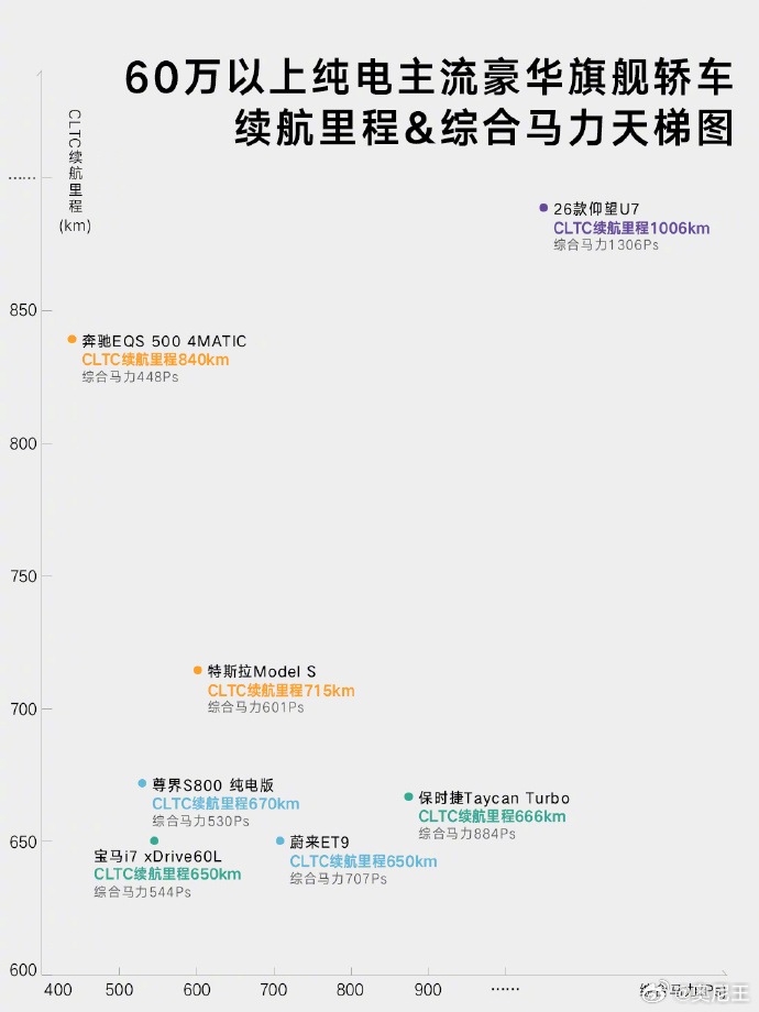 以前选电车,像在挤牙膏:马力大的,跑不远;跑得远的,充电慢。这次仰望直接把天花板捅破了:电池只重了23kg,电量多了近15度,续航破千的同时,还能稳住四电机满功率输出1300多马力。更关键的是,充电速度没掉队,彻底打破了“大电池必慢充”的魔咒。