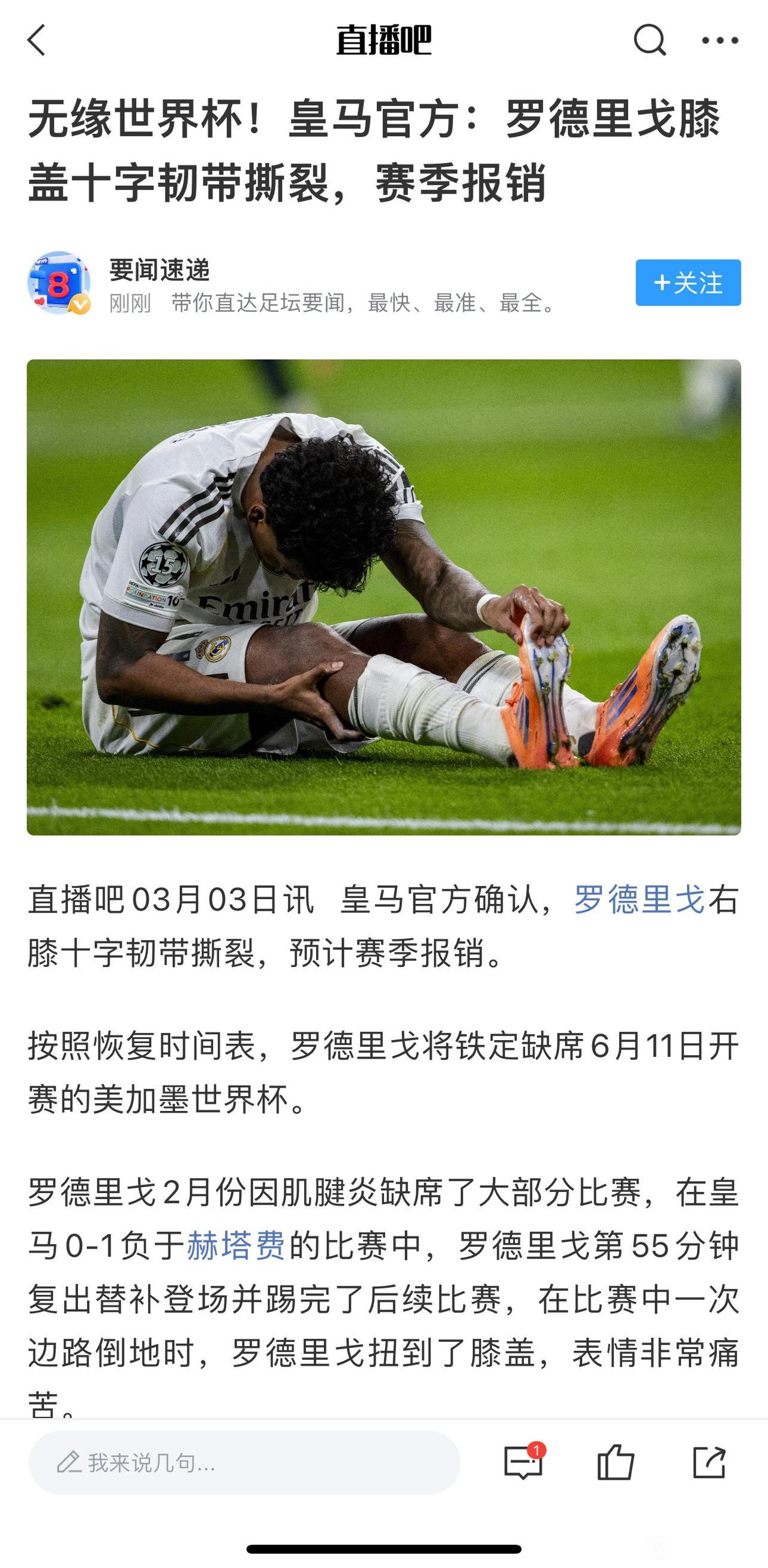世界足坛最倒霉的球员,罗德里戈重伤了。 本来他在皇马就岌岌可危,本赛季3球4助攻,多数时间是替补出场。 结果赛季报销,世界杯都去不了。 感觉命运多舛,前几年轻松拿欧冠,这几年越来越难了。[可怜]