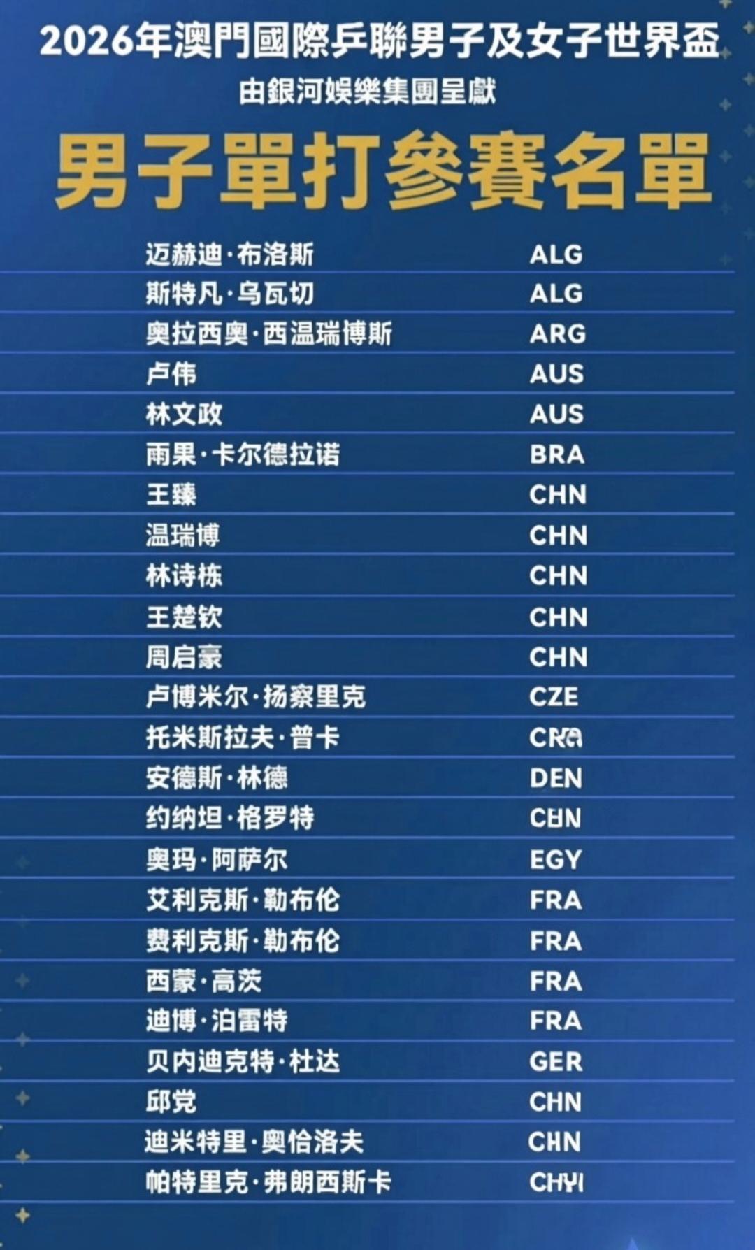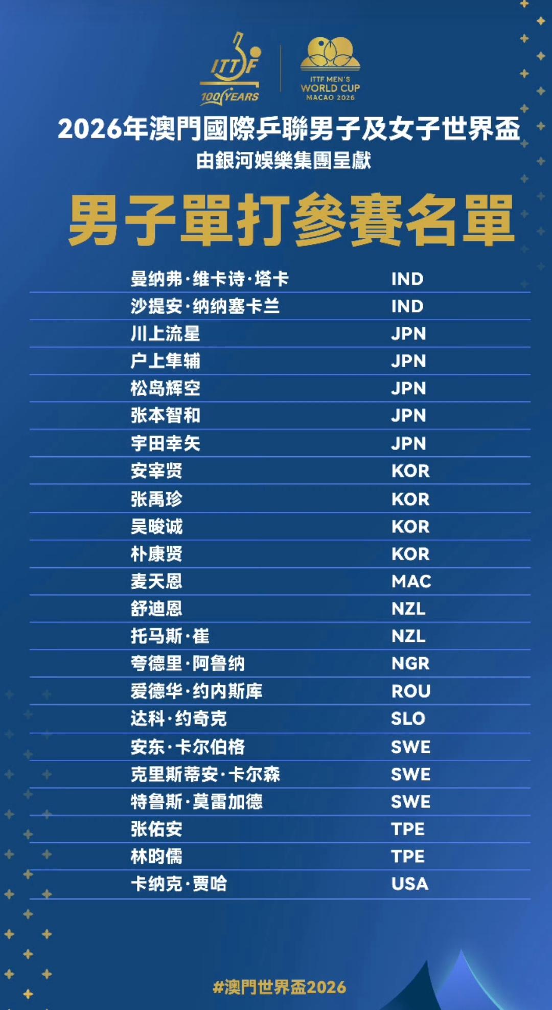 2026年国际乒联男子世界杯参赛大名单公布,群雄逐鹿澳门上演巅峰对决! 2026年男子乒乓球世界杯 将于3月30日至4月5日在澳门拉开战幕,赛事主办方正式公布男子单打参赛大名单,来自全球20余个国家及地区的顶尖选手齐聚濠江,将为乒乓球界最高荣誉之一展开激烈角逐。 中国乒乓球队派出王楚钦、梁靖崑、林诗栋、周启豪、温瑞博五人出战,其中王楚钦作为核心人物,将力争冲击个人首个世界杯单打冠军; 日本队由张本智和领衔,松岛辉空、川上流星等新生代选手紧随其后,展现“后浪”冲击力; 韩国队安宰贤、张禹珍等悍将蓄势待发,欧洲劲旅德国队的邱党、奥恰洛夫与法国队勒布伦兄弟、西蒙·高茨等名将亦在列,非洲冠军阿鲁纳、卫冕冠军雨果、美国选手贾哈等代表各自大洲的最高水平。 本届世界杯不仅汇聚了老中青三代顶尖高手,更将通过创新观赛体验和全球转播,向世界展现乒乓球运动的魅力。目前各队已进入最后备战阶段,这场“小球大戏”有望成为2026年体坛最受瞩目的赛事之一。 加油国乒!
