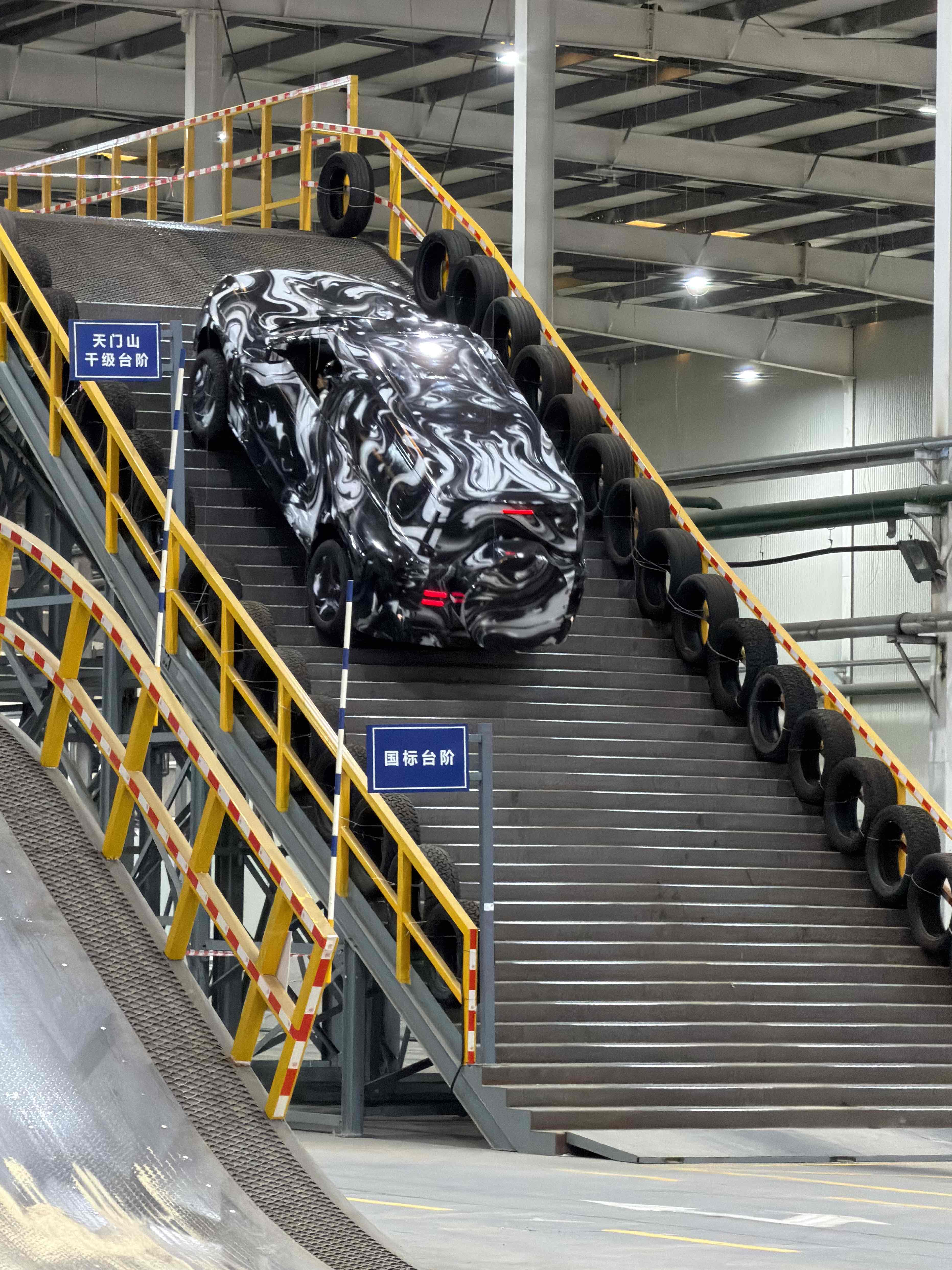 更让人震惊的是,视频中的“天门山千级台阶”并非实景,而是比亚迪在自家厂房里1:1复刻的极限工装。台阶高度约18厘米,坡度超35°,路面采用钢板材质,附着力比天然岩石更低,对车辆的四驱控制和车身刚性考验更为严苛。