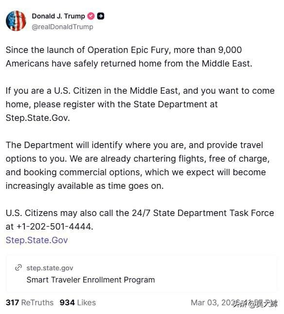唐纳德·特朗普在Truth Social上表示,自“史诗狂怒”行动开始以来,已有超过9000名美国人从中东平安返回家园: “自‘狂怒行动’启动以来,已有超过9000名美国人从中东平安返回家中。 如果你是身处中东的美国公民并希望回国,请在国务院网站 Step.State.Gov 登记信息。 国务院将确定你的位置,并为你提供返程方案。 我们已在安排免费包机,并在预订商业航班机票,预计随着局势发展,航班数量将会越来越多。”
