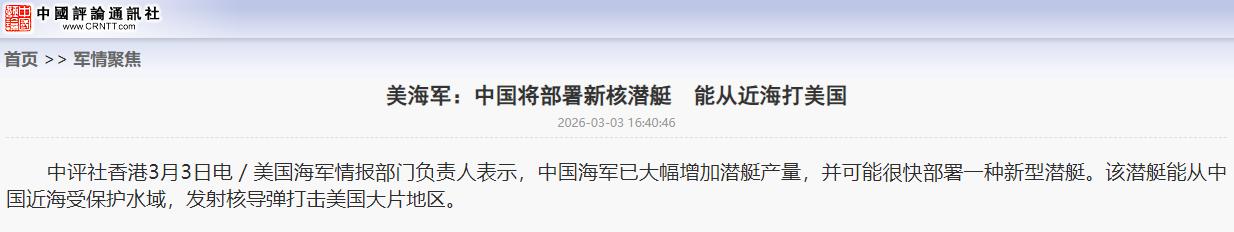 美伊战争第四天,没想到美国海军情报局局长却对中国说了这样一番话! 美媒彭博社3月3日报道,美国海军情报局局长布鲁克斯少将称,中国海军已大幅增加潜艇产量,并可能很快部署两款新核潜艇095型和096型。该潜艇“能从中国近海受保护水域,发射核导弹打击美国大片地区”。 这又是美国在故意炒作“中国威胁论”,玩的还是他们的老套路。这些年,美国就没停过这种操作,表面上天天盯着伊朗、朝鲜这些国家,又是制裁又是威慑,搞得好像大敌当前一样,但实际上,他们心里最惦记、最防备的,从来都是中国。 只不过有时候不好直接针对中国,就找个其他国家当幌子,偶尔发布这种渲染性的声明,目的就是制造焦虑,让国际社会对中国产生误解,同时也给自己扩充军备、在亚太地区搞霸权找借口。 要说我们的核潜艇是为了主动打击美国,那就是纯粹的造谣抹黑了。布鲁克斯说096型能从中国近海打击美国大片地区,从技术上来说,096型作为新一代战略核潜艇,搭载的巨浪-3潜射导弹,射程确实能达到10000公里以上,从中国近海发射,确实能覆盖美国部分地区,这是客观存在的技术能力,但这绝不代表我们会主动去攻击谁。 中国这些年,从来没有主动挑起过任何一场战争,也从来没有用武器去威胁过任何一个国家。我们一贯奉行的都是防御性国防政策,发展武器装备,包括核潜艇,目的只有一个,就是自卫,就是保护我们自己的国家和人民,保护我们的近海安全,不让任何国家有机会侵犯我们的主权和领土完整。 美国之所以这么炒作,说白了就是自己心里有鬼。他们常年在全球各地搞霸权,到处部署军事力量,动不动就用武力威胁其他国家,现在看到中国的国防力量越来越强,看到我们的核潜艇技术越来越先进,就开始坐不住了,担心自己的霸权地位受到威胁,所以就故意夸大中国的军事力量,把中国塑造成“威胁”,好让自己有理由继续扩充军备,继续在亚太地区搞围堵。 还有一点必须明确,中国的武器装备,从来都不是摆设,不管是核潜艇,还是之前披露的太原舰,或是其他先进武器,每一件都是为那些威胁中国、准备犯我中华的人准备的,而且我们时刻都在准备着。 这些年,美国在我们的近海附近,没少搞小动作,一会儿派军舰闯入我们的领海,一会儿派军机抵近侦察,不断挑衅我们的底线,搜集我们的军事数据。他们以为我们会怕,以为我们的武器只是用来摆样子的,但他们打错了算盘。 我们发展这些先进核潜艇,不是为了去攻击谁,而是为了在有人敢来挑衅、敢来侵犯我们的时候,我们有能力反击,有能力保护好自己。 现在的中国,已经不是几十年前那个任人欺负的中国了,我们有足够的实力,应对任何外部威胁。美国越是炒作,越是渲染,就越能说明,他们已经感受到了中国的强大,已经开始忌惮我们了。 美国总是打着各种幌子,防着中国,时不时就发布一些渲染性的声明,试图抹黑中国。但事实胜于雄辩,中国的国防发展,从来都是为了自卫,从来都是为了维护地区和世界的和平稳定。 我们的核潜艇,我们的各种武器装备,都不是摆设,它们是我们国家的底气,是我们人民的后盾,是用来对付那些敢来威胁我们、侵犯我们的“豺狼”的。 布鲁克斯的这番话,本质上就是美国霸权思维的体现,他们习惯了自己一家独大,习惯了用武力压制其他国家,现在看到中国在国防领域不断进步,就开始焦虑不安,用这种老套的炒作方式,试图阻碍中国的发展。 但他们显然错了,中国的发展不会因为他们的炒作而停止,中国保卫自己国家的决心和能力,也不会因为他们的抹黑而动摇。 总而言之,中国海军增加潜艇产量,研发095型、096型核潜艇,都是正常的国防建设,无可厚非。我们的武器装备,从来都不是用来炫耀的,也不是用来主动攻击别人的,而是为了守护我们自己的家园,为了应对那些潜在的威胁。 那些准备威胁中国、犯我中华的人,一定要看清楚,中国现在有足够的实力,有足够的底气,应对任何挑战,我们的武器时刻准备着,只要你们敢来,就一定会付出应有的代价。美国也别再自欺欺人地炒作了,好好管好自己的事,停止在亚太地区的霸权行为,才是正道。
