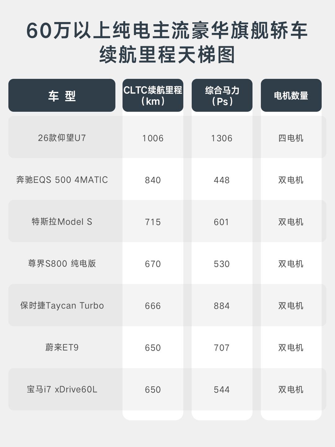 千公里续航+四电机,仰望U7打破“不可能三角” 四电机高性能且超1000公里长续航,唯有U7。 这不仅是仰望U7的硬核标签,更是纯电技术的一次“破局”。 过去,纯电市场一直存在“性能、续航、快充”的不可能三角。想要极致的1300马力性能,往往需要牺牲续航;想要1000公里超长续航,又难以兼顾四电机的满功率输出。而仰望U7,这位“三好学生”,用硬核技术给出了全都要的答案。 硬核数据:双千时代正式开启 • 超千公里续航:搭载150.01kWh第二代刀片电池,CLTC纯电续航达到1006km,彻底告别续航焦虑。 • 四电机满血性能:依托易四方技术,综合功率超1300马力(约960kW),零百加速仅需2.9秒,性能与续航首次实现完美统一。 技术基石:第二代刀片电池的跨代升级 新款仰望U7首搭第二代刀片电池,这不仅是容量的提升,更是能量密度、倍率输出与充电倍率的协同进化。它不仅装下了150度电,更支撑了四电机的极限输出,让“越大越慢”的充电焦虑成为历史。 高端纯电的代差优势 在高端纯电市场,仰望U7填补了“千马力+千公里”组合的市场空白。它不再只是某一项的拔尖,而是性能、续航、安全(磷酸铁锂体系)的全能战士,堪称地表最强纯电旗舰EV。