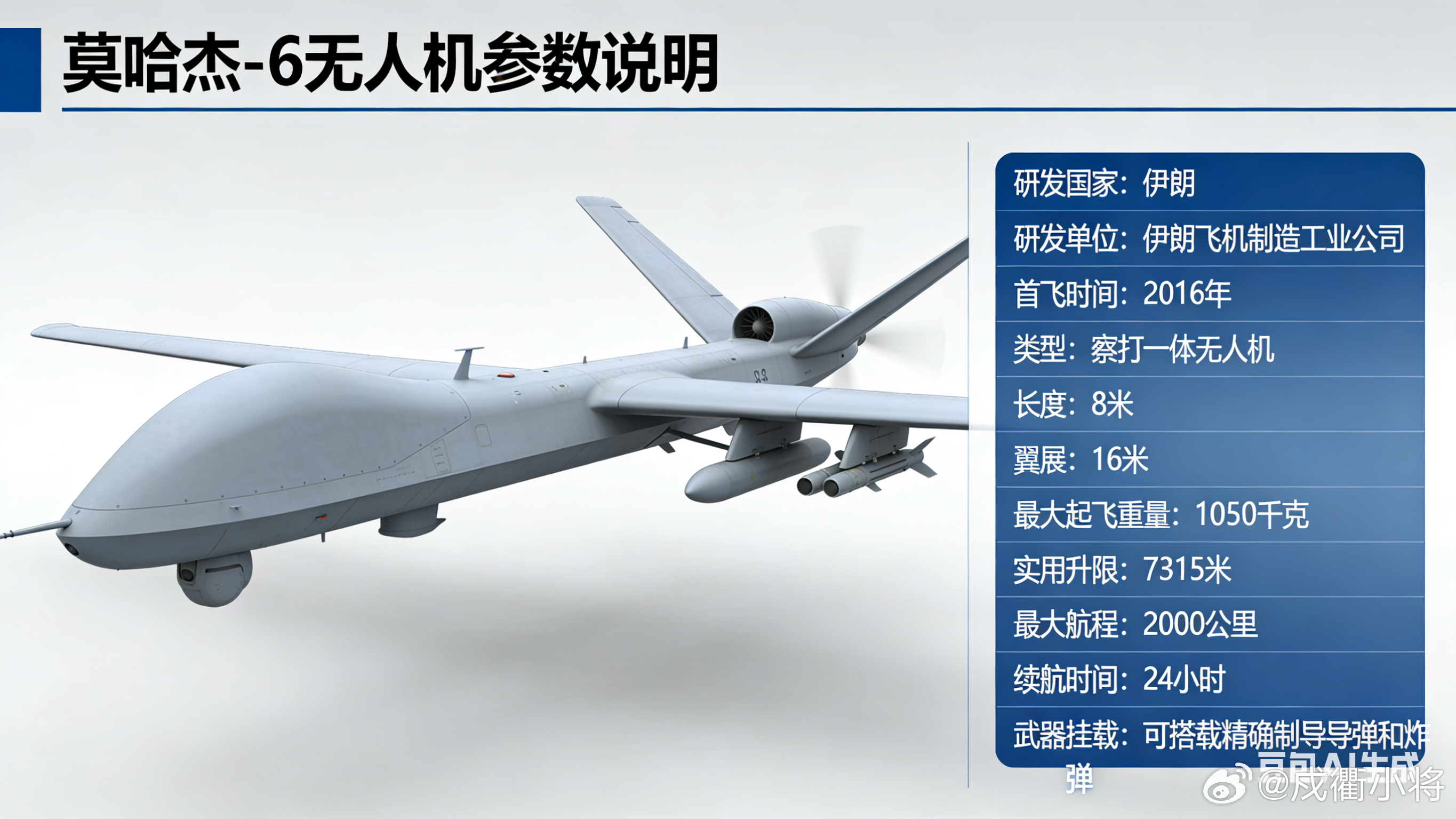 莫哈杰-6是伊朗研制的中空长航时察打一体无人机,采用双尾梁与倒V型尾翼布局,集光电侦察、目标锁定与精确打击于一体,可挂载多型制导弹药执行昼夜作战任务。该机具备长航时滞空能力,适配边境巡逻、对地打击、情报监视等多重任务,经过多次实战检验,是伊朗主力出口型军用无人机,广泛应用于中东及多国冲突场景。全球武器装备盘点军事ai新视野美伊以冲突