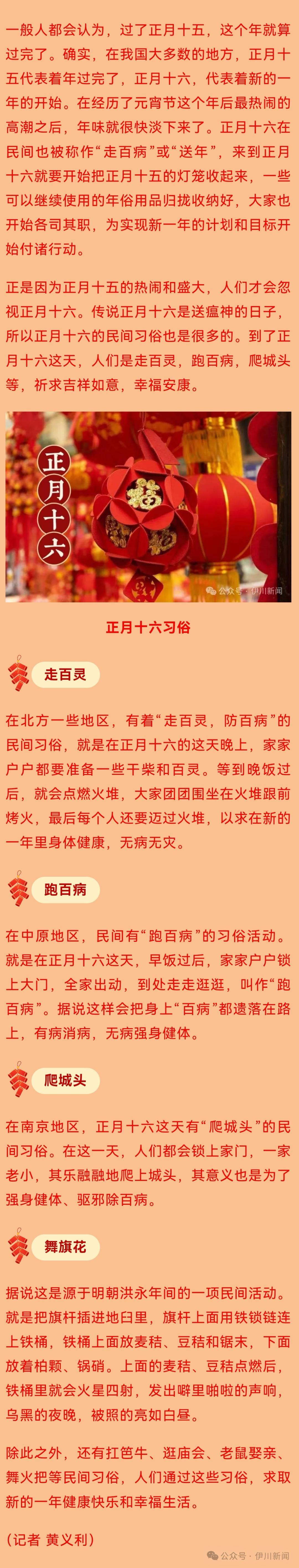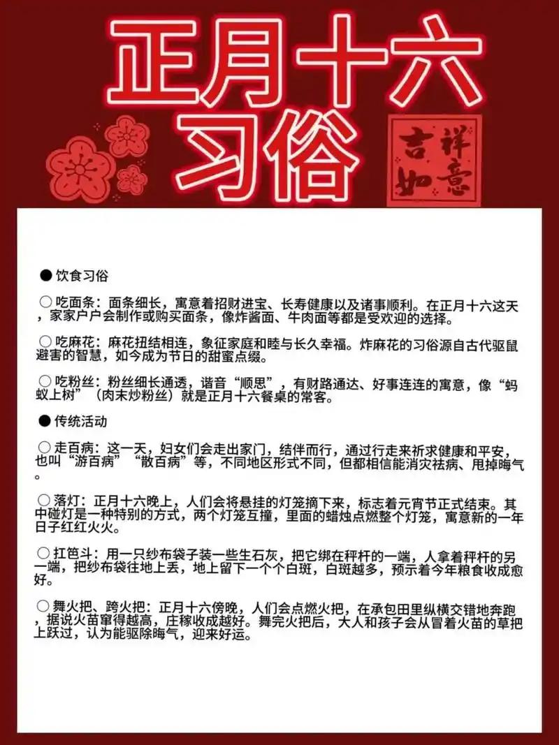 你了解的哪些正月十六习俗? 正月十六是农历新年后的第十六天,俗称“正月十六”,在中国许多地区都有丰富多彩的传统习俗。以下是一些较为常见且具有代表性的正月十六习俗: 开灯节 / 灯节 有些地方将正月十六称为“开灯节”,这一天晚上家家户户点亮灯笼,象征新的一年光明吉祥。与元宵节的灯会相比,开灯节更注重家庭氛围,寓意驱除黑暗,迎接光明。 祭灶神 正月十六是祭灶的日子,尤其在北方部分地区,民间会举行祭灶仪式,感谢灶神过去一年的庇佑,并祈求新的一年家宅平安、五谷丰登。 吃“正月十六粥” 一些地方有吃“十六粥”的习俗,这种粥通常由多种谷物和豆类熬制而成,寓意健康长寿、五谷丰登。 送穷日 / 扫尘日 有的地区把正月十六作为“送穷日”,这一天家家户户会彻底打扫卫生,象征把穷气和晦气扫出门,迎接新年的好运气。 祭祖和拜神 正月十六也是一些地方祭祖的日子,人们会到祖坟扫墓,祭拜祖先,表达对先人的怀念和敬意。 社火表演继续 在部分地区,元宵节后的正月十六仍会有社火、舞龙舞狮等民俗表演,延续节日的喜庆氛围。 开市 / 开工 有些商业活动选择在正月十六这天开市或开工,寓意新年事业顺利,财源广进。 吃“甜食” 有些地方习惯在正月十六吃甜食,象征生活甜甜蜜蜜,幸福美满。 不同地区的习俗会有所差异,但总体来说,正月十六是一个承接春节气氛、祈福迎新的重要日子。你所在的地方有没有特别的正月十六习俗呢?欢迎分享!