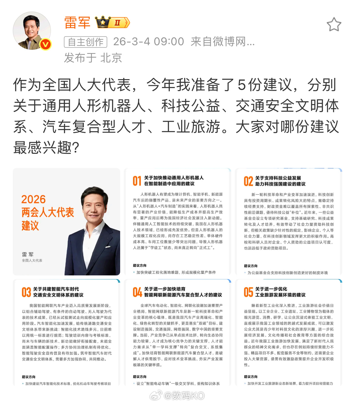 雷军今年两会的准备的五份建议来了,非常的接地气。具体如下一:推动人形机器人在智能制造应用二:支持科技公益三:共建智能汽车交通安全体系四:培育智能网联汽车复合型人才五:优化工业旅游环境这五件事也正是小米积极推进,正在做的事情。目前:米人形机器人已进入汽车工厂“实习”,在自攻螺母上件工站连续3小时自主运行,双侧同时安装成功率达90.2%,可匹配76秒产线节拍。小米公益基金会规划捐赠超17.8亿元,设立“小米奖助学金”“小米青年学者”等项目,已资助1.2万名学生和807名青年教师。小米获北京L3级自动驾驶路测牌照,构建“五层安全体系”,并积极参与行业标准讨论,推动智能驾驶技术规范与驾驶培训考核标准的衔接。小米与西安汽车职业大学、吉林科技职业技术学院等共建“小米汽车产业学院”,推行“双导师”制,每年培养数百名新能源汽车人才。小米汽车工厂入选北京市工业旅游示范点,累计接访游客:25年全年13万人次,开放压铸、总装等六大车间,游客可见证76秒下线一辆车的智能制造场景。 雷军2026两会准备5份建议