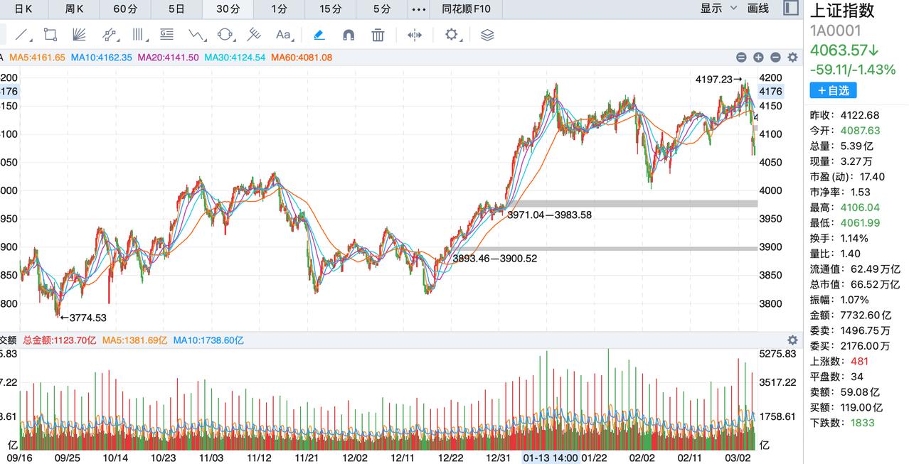 大盘破掉4100点影响不小,这是近期比较强的支撑点,还有4050,这个点很多人是不是觉得也会破?负责的说4050破的可能性不大,如果不是中东冲突4100也不太可能破,这就是近期大盘的逻辑! 既然4050支撑力强,那么是不是就可以无脑干呢?错,这个时候就是最难熬的时候,我们之前讨论过,如果石油概念和黄金概念走弱,谁会接过大旗,答案很简单是新能源和农业,从今天的盘面来看,电力第一个走强,然后是农业,电力走强的逻辑是电力是算力的底层,电力公司的盈利能力都很强,电力板块被选中是正常的,农业是3月份的重点板块,而且还是处于低位,被拉起很正常! 最后还有一个板块,那就是新能源,这个板块应该会在本周有表现,可以适当关注!