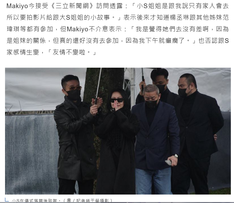 【Makiyo缺席大S雕像揭幕原因】2月2日,大S纪念雕像仪式揭幕。大S生前亲友几乎都到场,阿雅(柳翰雅)、吴佩慈、范玮琪、范晓萱,却被发现独缺Makiyo (川岛茉树代),引发外界质疑。Makiyo近日对媒体表示,小S有邀她拍摄纪念仪式播放的影片,但当时以为该仪式仅限家人参与,加上当天在家中突然癫痫发作,身体状况欠佳,因此并未前往。事后,Makiyo才发现不仅S家人,连过去跟她闹过嫌隙的杨丞琳皆受邀出席。被问及和S家的关系是否生变? Makiyo解释,因体谅小S与家人仍处于悲伤中,所以并未主动打扰,强调双方“有一段时间没联络,但没有不好”,未来会再找时间亲自到金宝山探望大S。(三立新闻网)