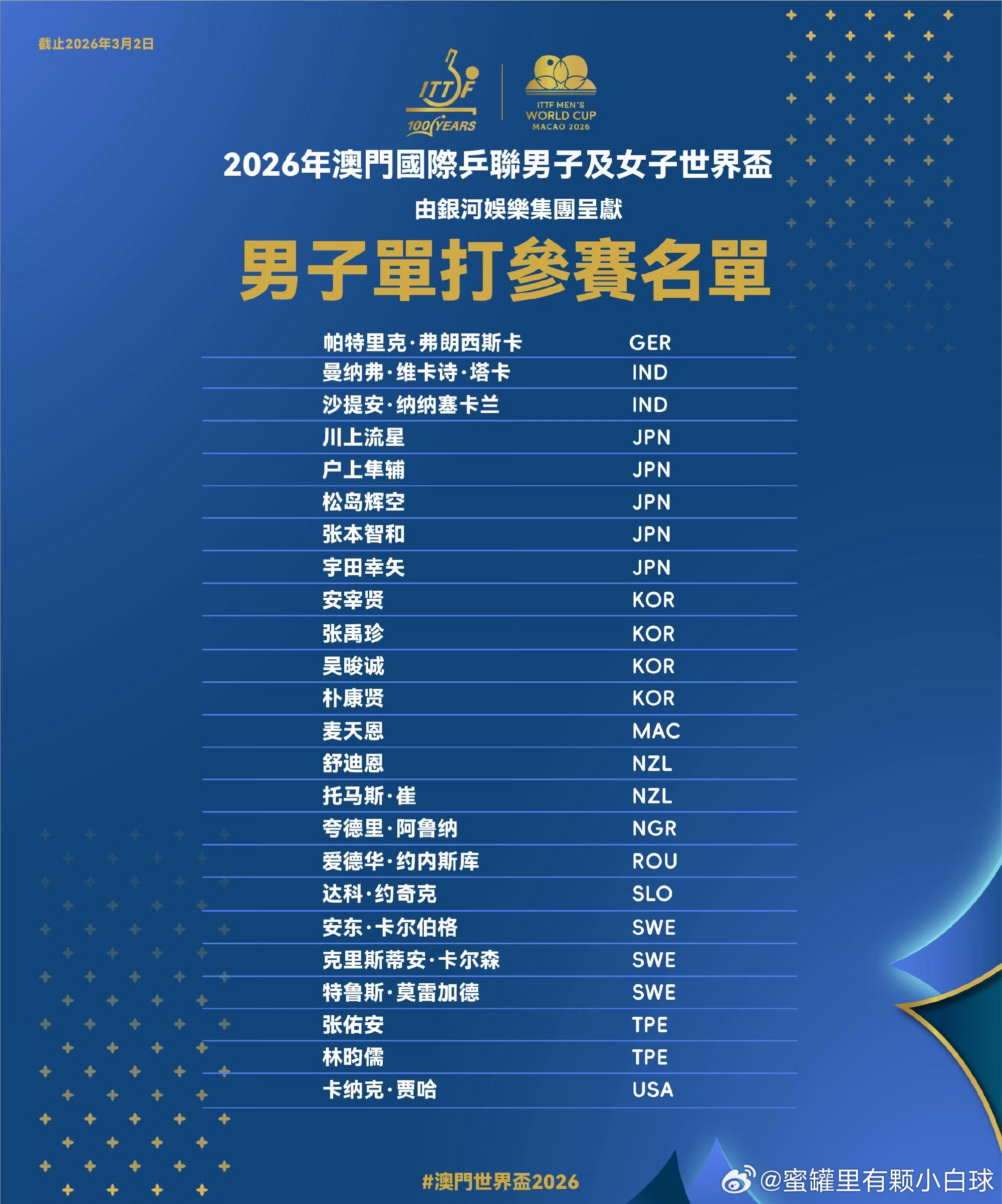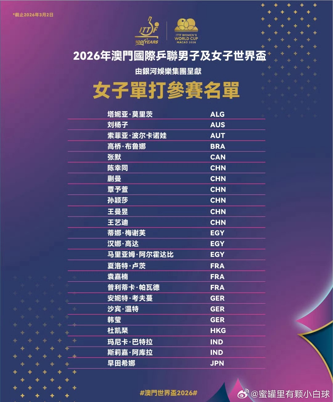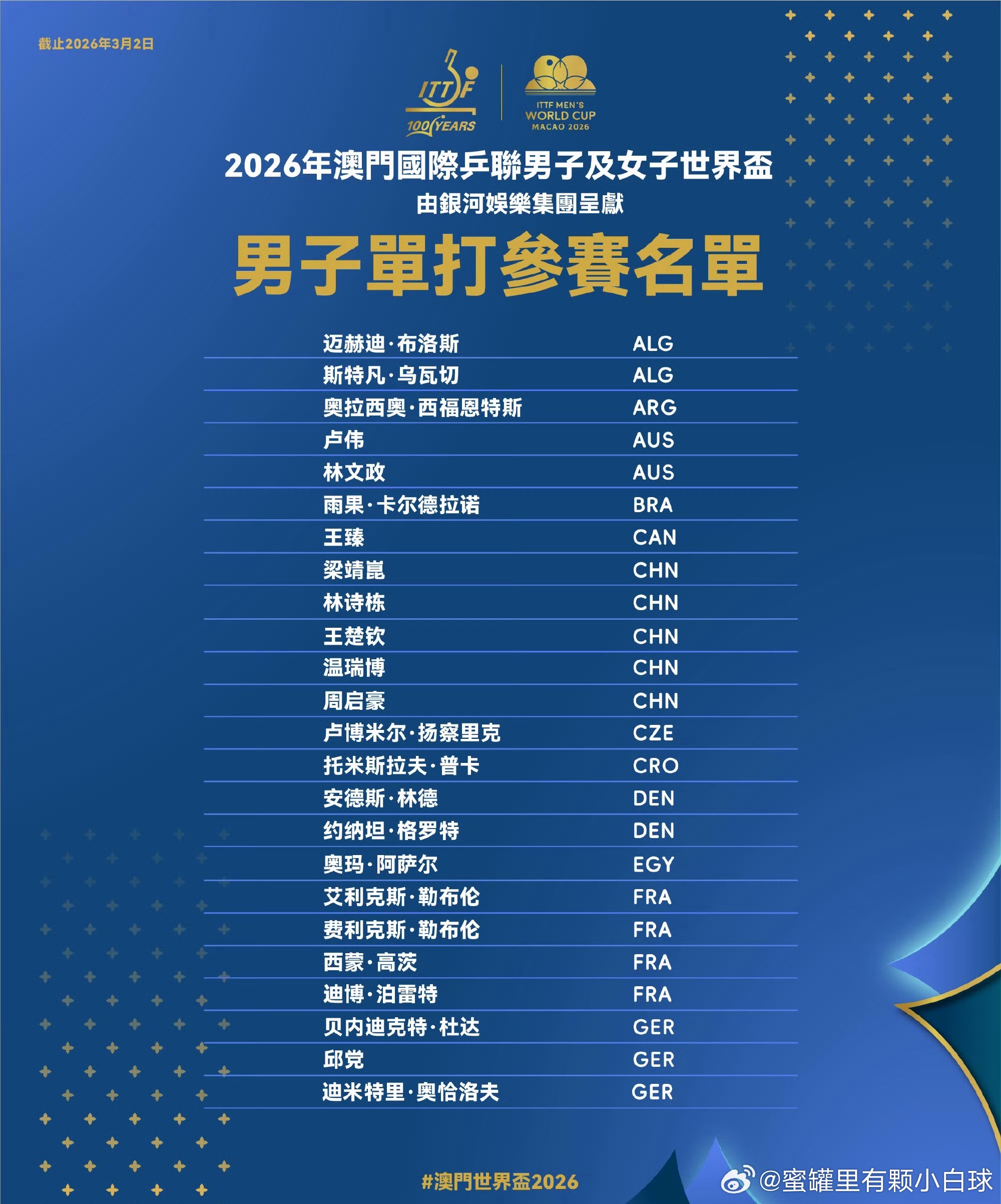 2026年国际乒联男子、女子单打世界杯将于3月30日至4月5日在中国澳门举行,届时将有48名运动员进行角逐,ITTF国际乒联更新参赛全名单。