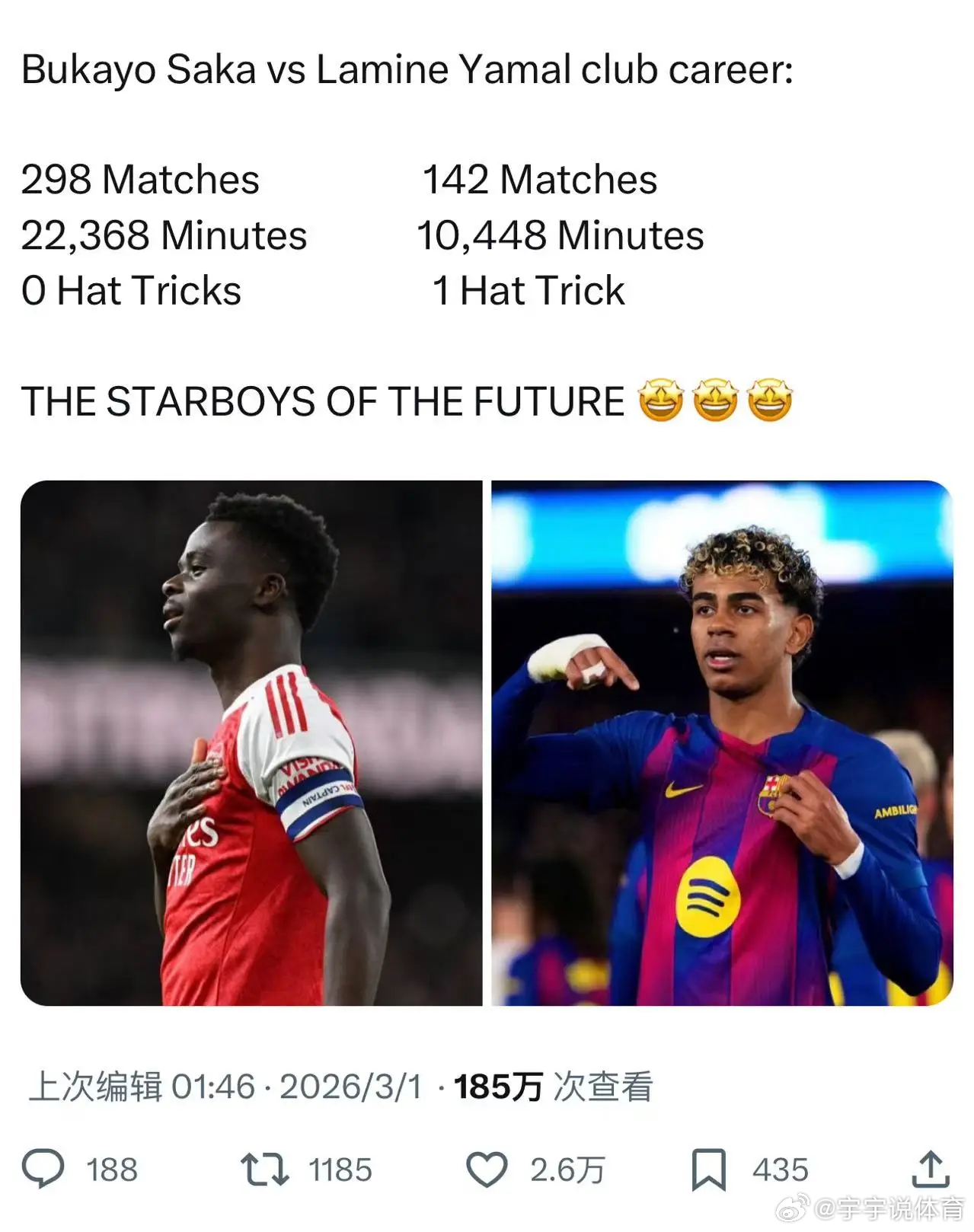 亚马尔两年踢的场次时间赶上萨卡六年踢的场次时间一半