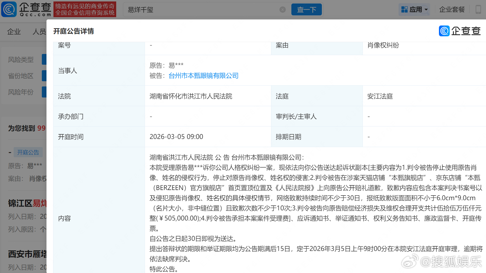 【易烊千玺维权案将开庭】企查查APP显示,易烊千玺起诉台州市本甄眼镜有限公司人格权纠纷一案将于2026年3月5日上午9时在湖南省怀化市洪江市人民法院开庭审理。易烊千玺请求法院判令被告停止对原告肖像权、姓名权的侵害,公开赔礼道歉并赔偿经济损失及维权合理开支共计50.5万元。易烊千玺告眼镜公司侵权索赔50.5万