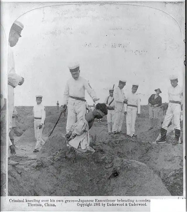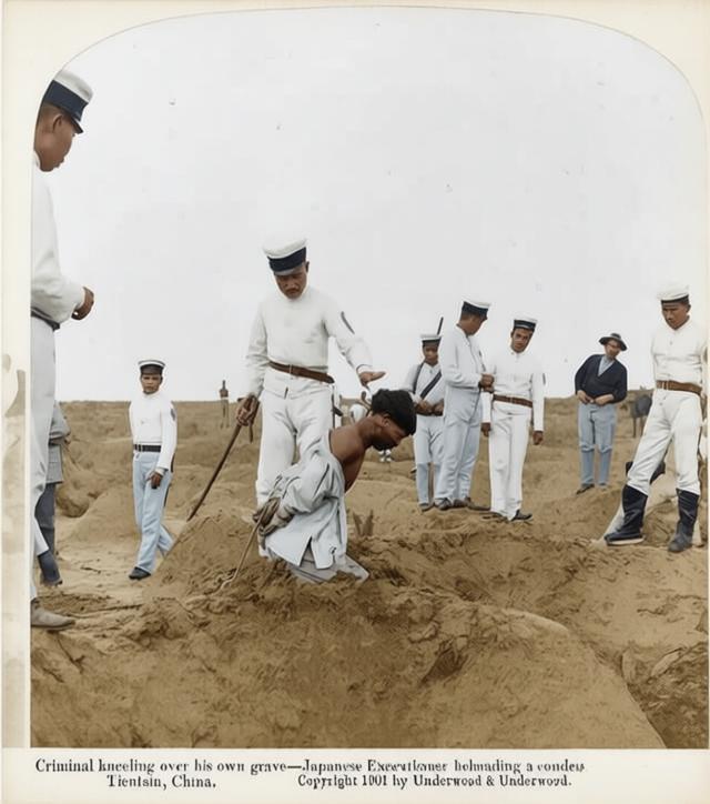 这张照片是八国联军侵华期间,日军在天津处决义和团成员的血腥现场,由美国著名立体照片公司Underwood & Underwood于1901年发行,是列强暴行的铁证。 照片中,一名清朝男子被蒙眼、反绑双手,被迫跪在自己的坟坑前。一名身着白色海军制服的日本军官,正手持军刀,准备对他执行斩首。周围站着数名日军士兵,表情冷漠,还有一名西方男子在旁围观,整个场景充满了暴力与冷酷。 这张照片拍摄于1900年八国联军攻占天津之后。在义和团运动中,日军是八国联军的主力之一,因在进攻天津时遭到义和团和清军的顽强抵抗,伤亡惨重,随后便展开了疯狂的报复性屠杀。照片中的受害者,很可能是一名被俘的义和团成员。