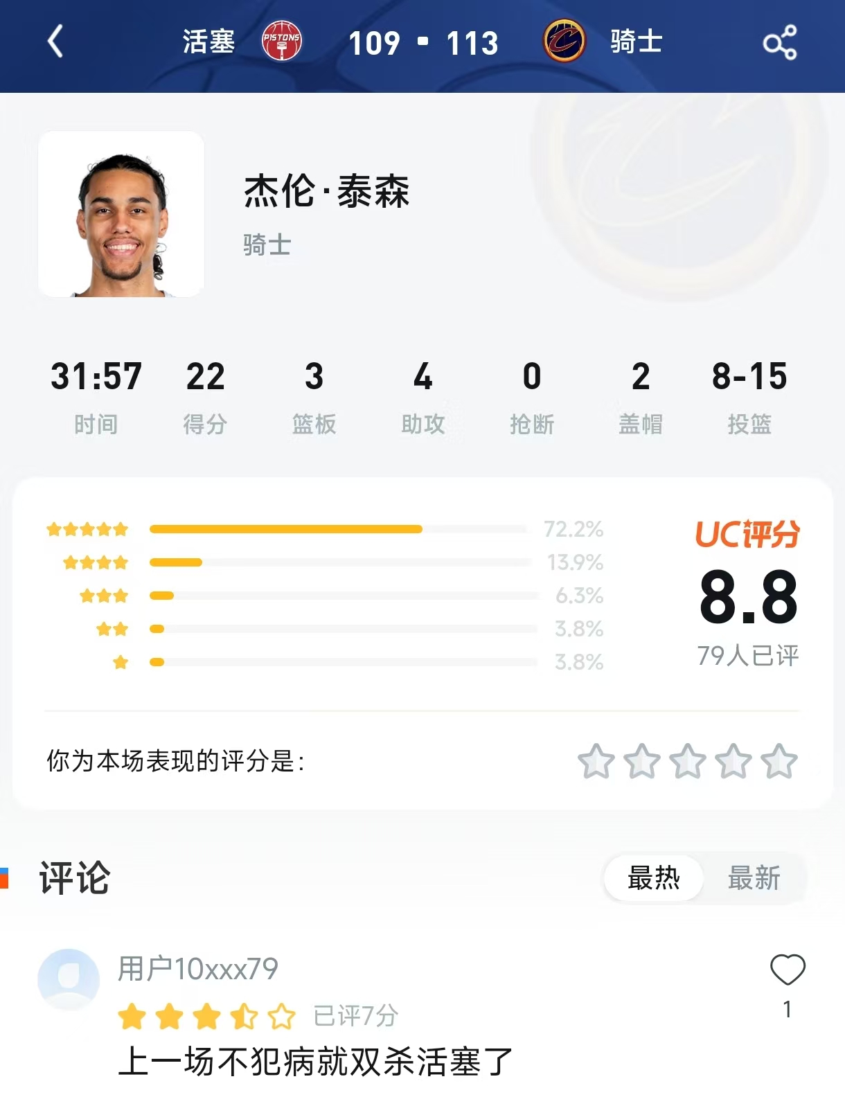 赛后,在UC体育的评分板块中,泰森的表现引发了球迷的热议。 比赛信息:活塞 109 - 113 骑士 球员:杰伦·泰森(骑士) 上场时间:31:57 | 得分:22 | 篮板:3 | 助攻:4 | 抢断:0 | 盖帽:2 | 投篮:8-15