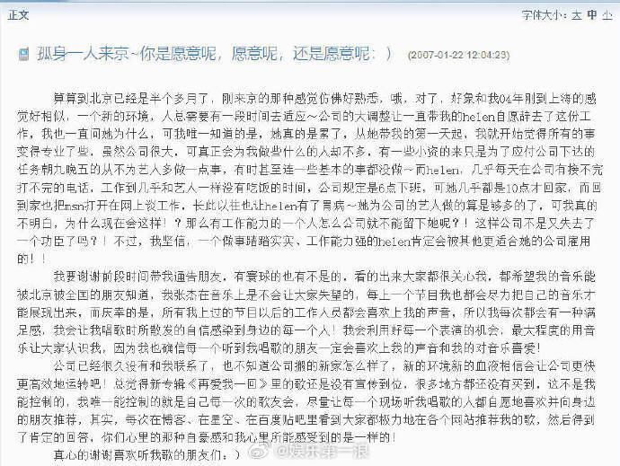 张杰2007年的博客张杰曾为前经纪人发声 有网友晒出了07年的博客,他在文中感慨前经纪人Helen因工作调整辞职,表示她很辛苦,并认为她的工作能力肯定能被更适合她的公司聘用。
