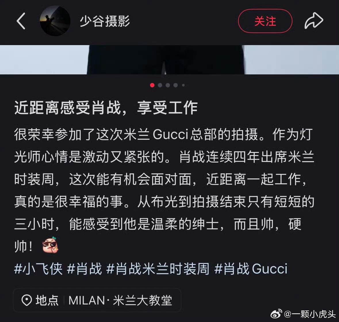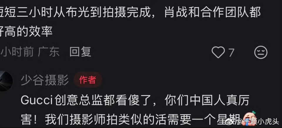 肖战给外国团队展示什么叫中国速度!和gucci此次米兰时装周合作的灯光师透漏肖战团队非常专业,从布光到拍摄结束仅用了3个小时,给gucci总监看傻了,直夸你们中国人真厉害,以往类似的工作,gucci的摄影师要一个星期才能完成!帖子结尾不该忘夸肖战是个温柔的绅士,而且帅,硬帅!