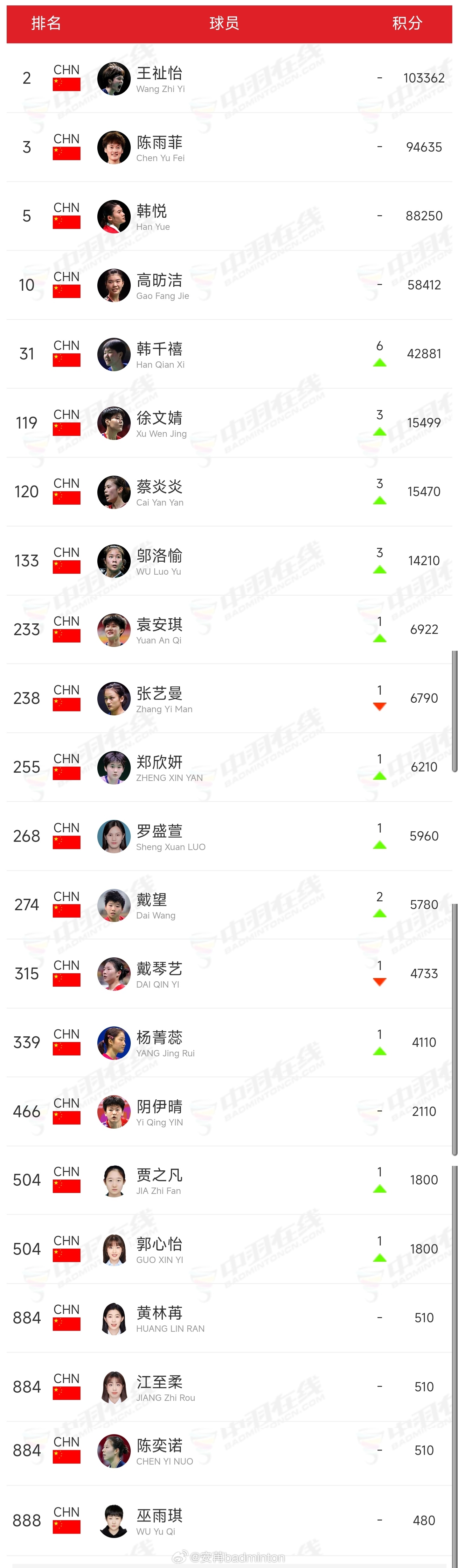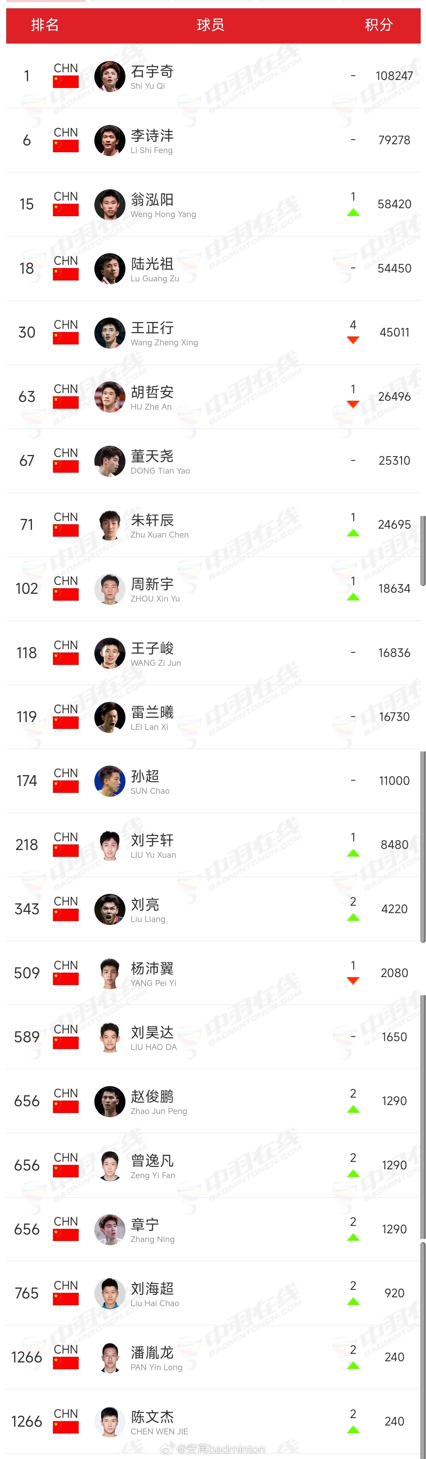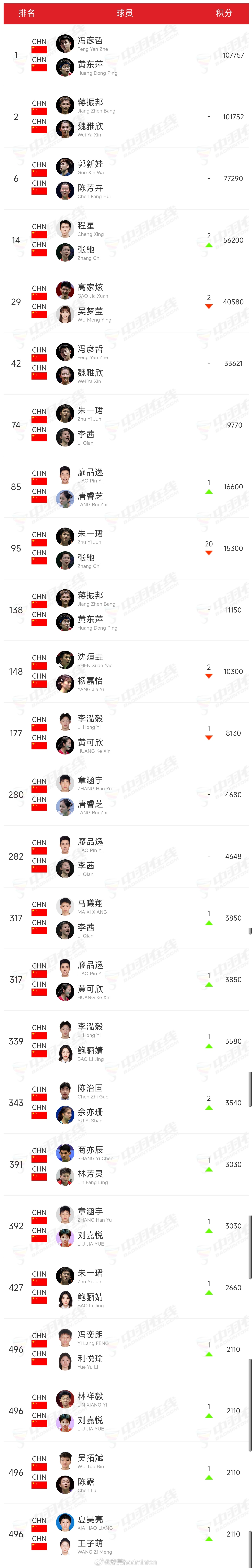 最新一期🇨🇳中国羽毛球队各单项世界排名
