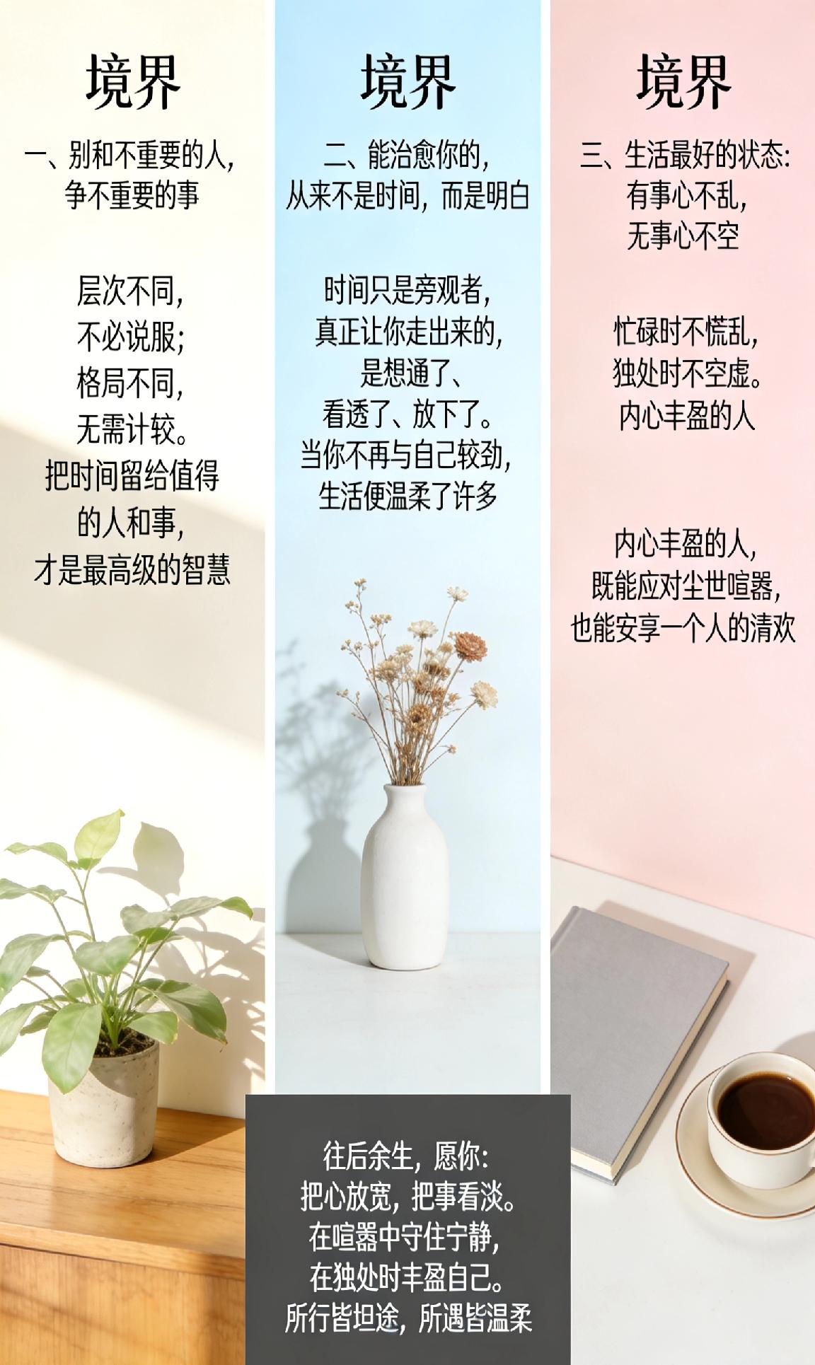 人生有三重境界,越早明白,活得越通透。 一、别和不重要的人,争不重要的事。 层次不同,不必说服;格局不同,无需计较。把时间留给值得的人和事,才是最高级的智慧。 二、能治愈你的,从来不是时间,而是明白。 时间只是旁观者,真正让你走出来的,是想通了、看透了、放下了。当你不再与自己较劲,生活便温柔了许多。 三、生活最好的状态:有事心不乱,无事心不空。 忙碌时不慌乱,独处时不空虚。内心丰盈的人,既能应对尘世喧嚣,也能安享一个人的清欢。 往后余生,愿你: 把心放宽,把事看淡。 在喧嚣中守住宁静,在独处时丰盈自己。 所行皆坦途,所遇皆温柔。
