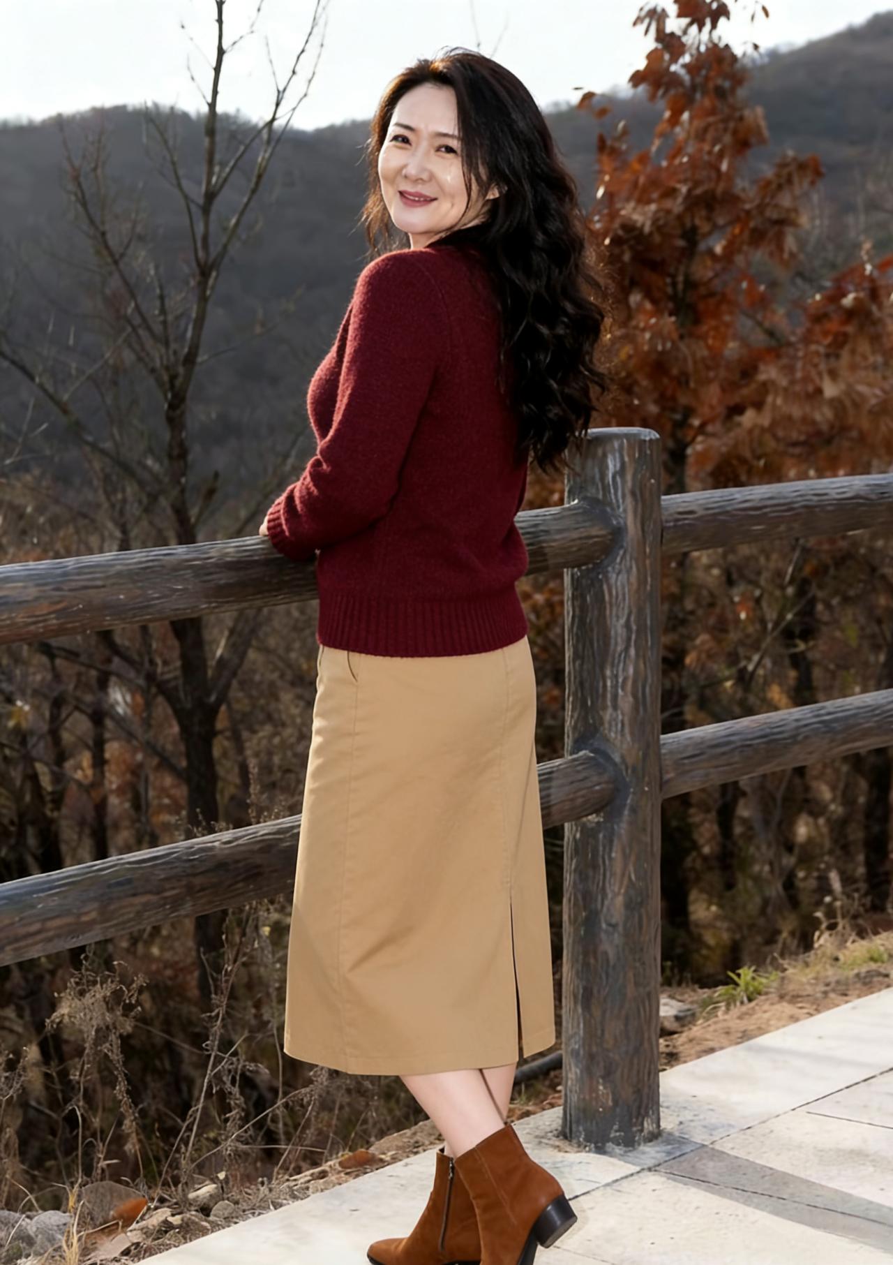 灰衫裹着秋山的风,过膝靴踩碎林间的光影 木栏旁的落叶红成晚霞,时光在纹路里慢慢沉淀 每一道褶皱,都藏着走过山野的温柔 ~ 转身踏入林荫的甬道,阳光筛下细碎的金 依旧是那件灰衣,黑裤贴着脚下的落叶路 风掠过发梢,掀动着与自然相拥的松弛 ~ 又行至雪覆的长街,灰衫在白色里站成风景 车辙碾过薄雪,寒意里透着从容的笑意 腕间的白,是时光递来的一枚温柔书签 ~ 皮衣掀起都市的风,灰裙摆摇响街头的喧嚣 指尖绕着卷发,把城市的烟火揉进衣角 公交与车流的背景里,开出一朵潇洒的花 ~ 风衣垂落时,秋山成了底色 手叉腰的瞬间,把旷野的底气穿在身上 灰衫藏在米色里,是温柔与利落的叠章 ~ 驼色短外套裹着针织裙,落叶停在指尖 长靴踏过铺满碎金的路,卷发拂着林间的风 这一刻,秋意都成了贴身的温柔 ~ 酒红毛衣斜倚着木栏,卡其裙扫过山间的凉 回眸时,卷发漾开的笑意,比满山红叶更暖 短靴踩在石板上,敲出岁月的温柔节奏 ~ 白卫衣配着牛仔,马尾扬起少年气的风 乡野的路在脚下,双手叉腰的模样 把时光的青涩与成熟,都揉进这一身轻快 ~ 最后又站回都市的路口,灰衫与黑裤依旧 车流在身后穿梭,目光里却藏着山野的静 每一身衣裳,都是岁月写给自己的信 每一次转身,都是与生活的美丽相逢