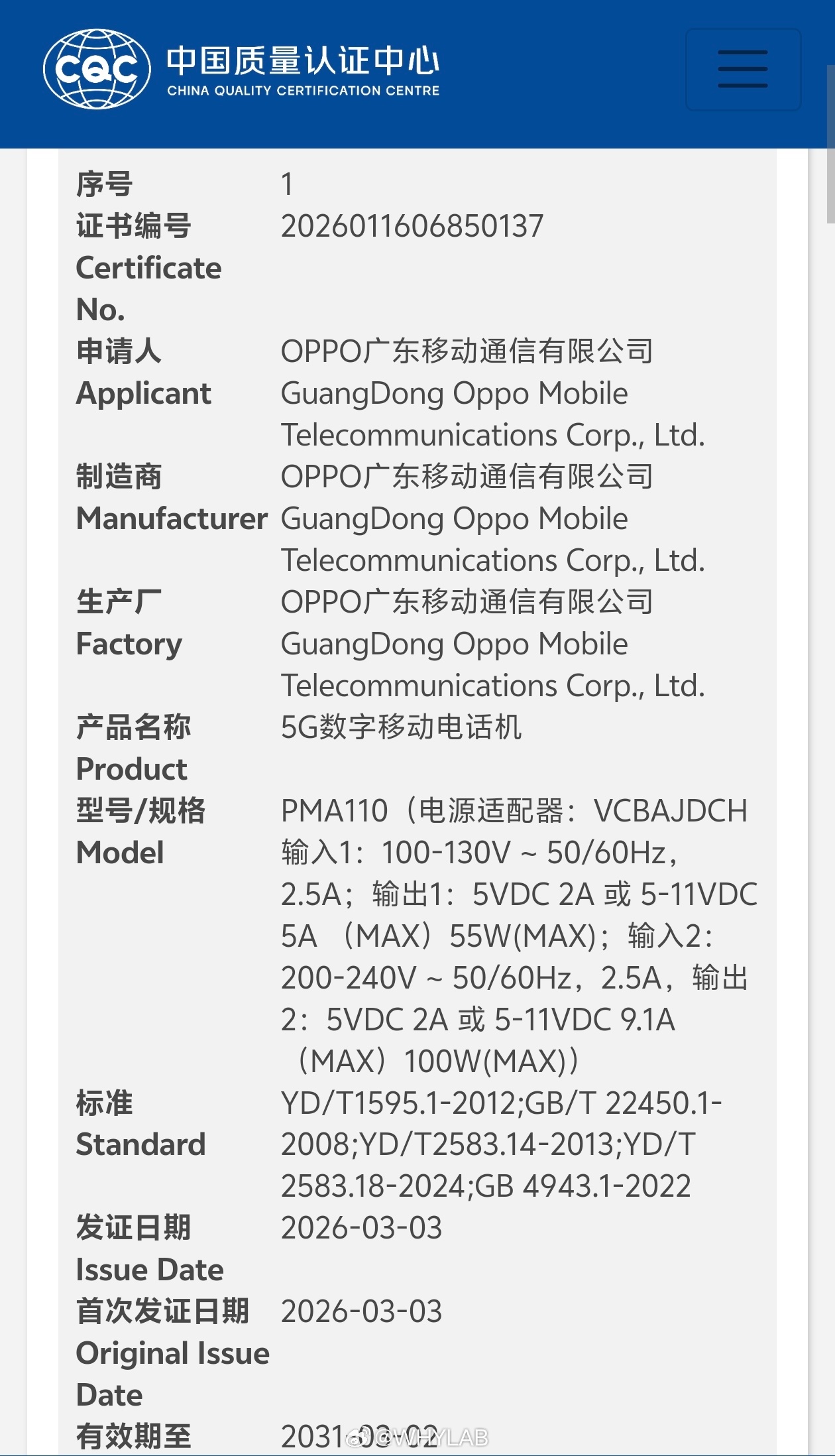 OPPO Find X9 Ultra 通过 3C 质量认证,三证齐了,型号 PMA110,支持 100W 快充,N79 频段,会有卫星通信版本。