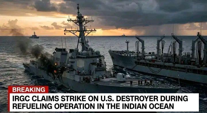 伊朗伊斯兰革命卫队宣布:其海军在印度洋袭击了一艘正在加油的美国海军驱逐舰。油轮和驱逐舰均遭到打击,且从它们的甲板上可以看到浓烟和火焰升起。 伊朗伊斯兰革命卫队于2026年3月4日宣布,其海军在印度洋距伊朗海岸约650公里处,使用“Qadr 380”和“Talaiyeh”巡航导弹袭击了一艘正在海上加油的美国海军驱逐舰及 accompanying 补给舰,称两舰被击中后甲板燃起大火。此次行动是“真实承诺-4”系列反击的一部分,目标为美军战略资产。目前美方尚未证实该袭击事件,尚无独立卫星影像或官方战损报告佐证,相关信息仍待核实。