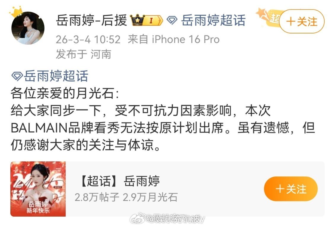 岳雨婷将缺席balmain大秀岳雨婷品牌看秀取消不可抗力因素,导致岳雨婷缺席本