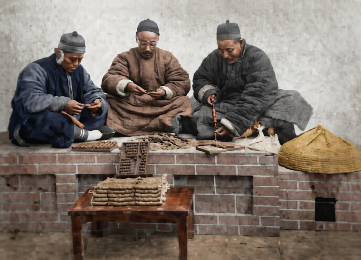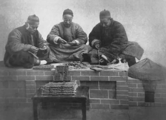 晚清,北方,三位男子身着长袍马褂与瓜皮帽,应该是是当时地主、商人或账房先生,他们围坐在砖砌的炕台上,专注地清点着面前的钱币。 桌上堆满了大量的铜钱与铜板,旁边还摆放着传统的算盘、账本和笔墨,炕前的方桌上则整齐码放着成串的铜钱。 在晚清,铜钱和铜板是民间最主要的流通货币,大宗交易和财富积累都以铜钱计算。照片中堆积如山的钱币,直观展现了这些人的财富规模。这种“数钱数到手抽筋”的场景,与同时期底层百姓衣不蔽体、食不果腹的生存状态形成了强烈对比。这些财富往往来自地租、商业利润或高利贷,是对底层劳动人民的剥削。
