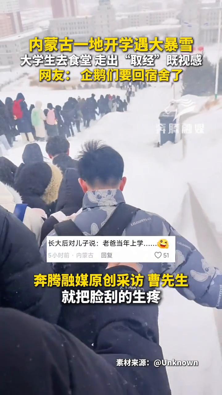 内蒙古一地开学遇大暴雪,大学生去食堂走出"取经"既视感。网友:企鹅们要回宿舍了。 奔腾融媒原创采访曹先生。 3月3日,内蒙古呼伦贝尔。风大雪大,连续下了一天多,这个雪就特别的深。当时也在下暴雪,雪蹭蹭往脸上刮像刀子一样,就把脸刮的生疼。雪基本上都有半米厚,后来踩出脚印,大家就一个接一个牵着下去了。