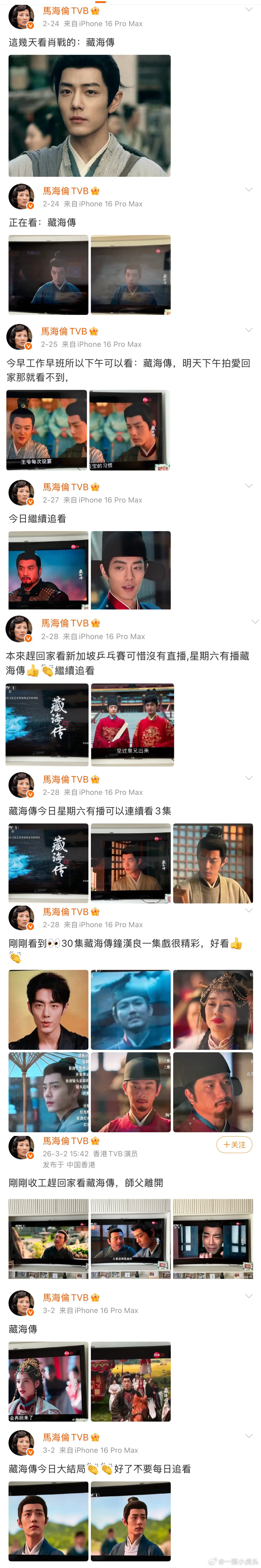 TVB演员马海伦在微博打卡追藏海传每天收工就守着电视追剧,看着她从2月 24号追到3月2号。期间还转发了肖战的安利博夸肖战英俊马老师太可爱了!藏海不愧是魅魔,瑛姑都拿捏了👏