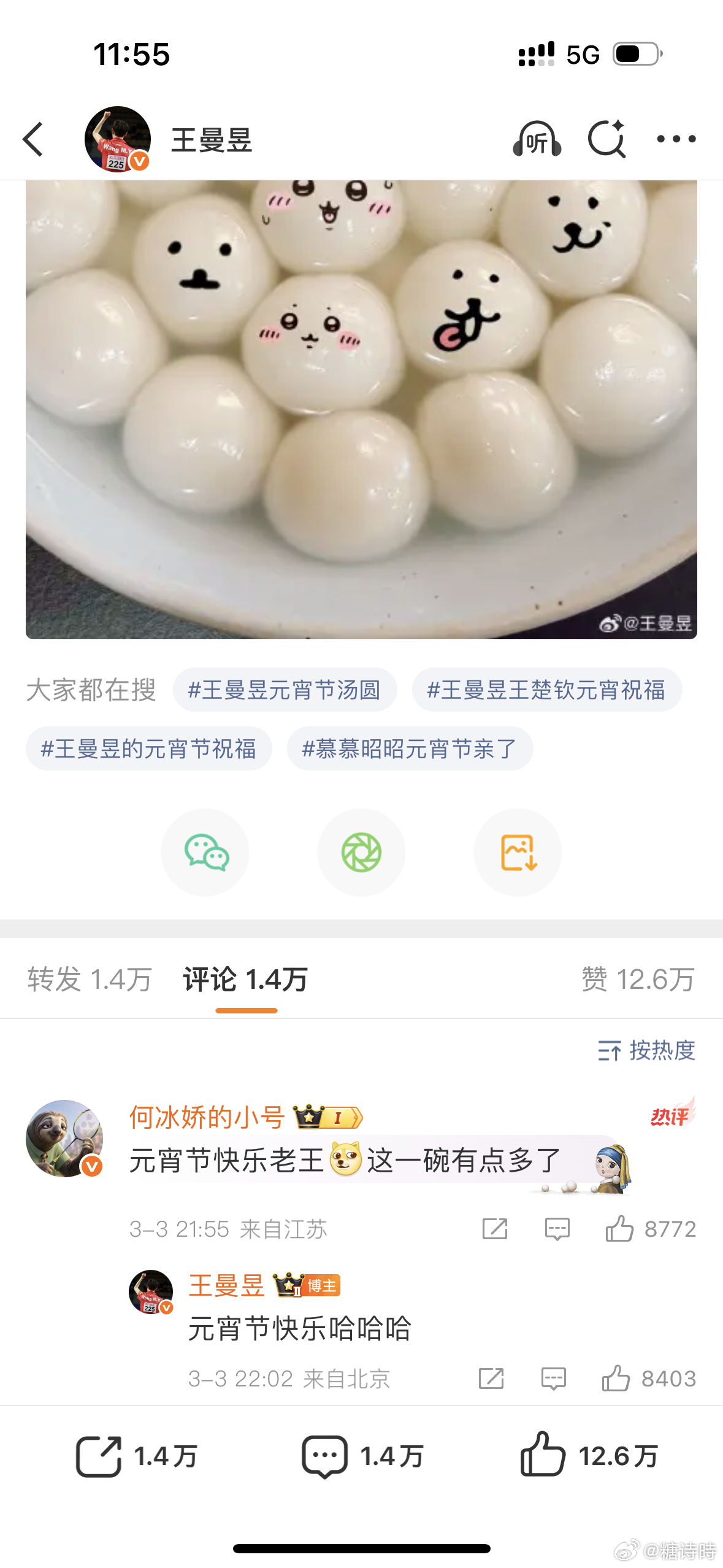 王曼昱何冰娇有爱互动 元宵节王曼昱发博祝大家元宵节快乐,配图一大碗汤圆,何冰娇评论王曼昱:元宵节快乐老王这一碗有点多了。果然是乒羽一家亲 王曼昱祝何冰娇元宵节快乐