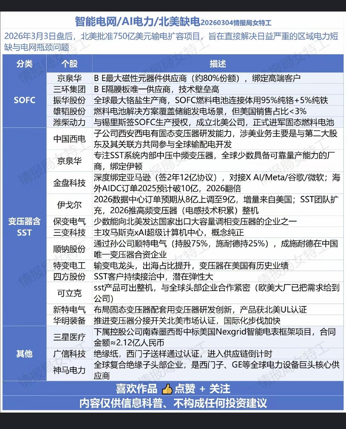 智能电网+AI电力+北美缺电! 3月3日,北美批准750亿美元输电扩容项目,旨在解决日益严重的缺电和电网瓶颈问题。 1.燃气轮机 2.储能 3.AIDC相关 4.固态变压器SST 5.燃料电池 相关核心龙头受益股: