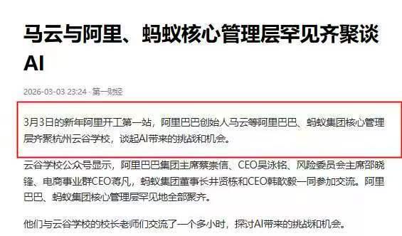 马云最新动向曝光,有点出人意料,但又在情理之中! 新闻报道称,马云和阿里、蚂蚁核心管理层罕见集体亮相,一同前往了杭州云谷学校,和学校老师们畅谈了AI时代下,对于孩子教育的影响。 开年第一站,马云和阿里高层现身的地点不是公司某个业务部门,而是选择在云谷学校,谈的也不是如何赚钱,谈的是AI和教育。 这确实有点意外,毕竟AI时代下,行业内都在想着如何利用AI发展自己的业务。 但马云和阿里关注的却是AI时代下孩子教育问题,这还是挺值得点赞的。 但是仔细想想也并不奇怪,因为纵观阿里这么多年,咱们会发现,阿里一直都有一种独特的气质,那就是在发展自身业务的同时,也不忘去关注社会问题,去解决社会难题。前不久马云还在线参加了马云乡村公益基金会“腊八之约”活动,同样围绕AI和教育,分享了自己的一些观点和看法。 其实,阿里一直都是一家非常具有前瞻性的公司,马云也多次在关键节点,做出了前瞻性的预判,比如在1995年的时候,就跟大家分享,互联网会改变中国。 2010年,马云就敏锐察觉云计算将会成为未来大国竞争、科技企业争夺的重点,于是力排众议,在行业内都不看好的情况下,坚定自研云计算。 而如今,面对AI时代的技术变革,马云和阿里再次行动起来,为AI时代下孩子的教育早做准备,这无疑是马云和阿里的又一次前瞻性预判,同时也是当下全社会都必须要关注的一个重点问题!