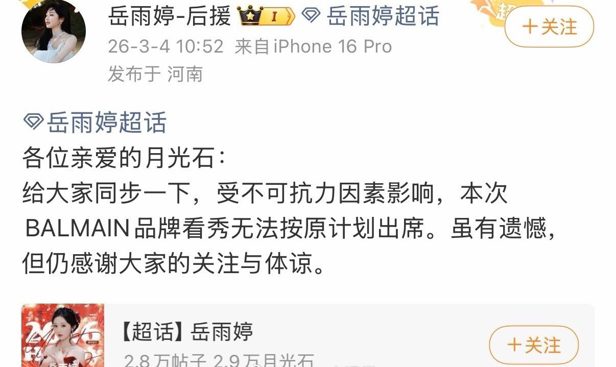岳雨婷缺席balmain看秀,工作室给的原因是受不可抗力因素影响,但网友说她没被邀请……
