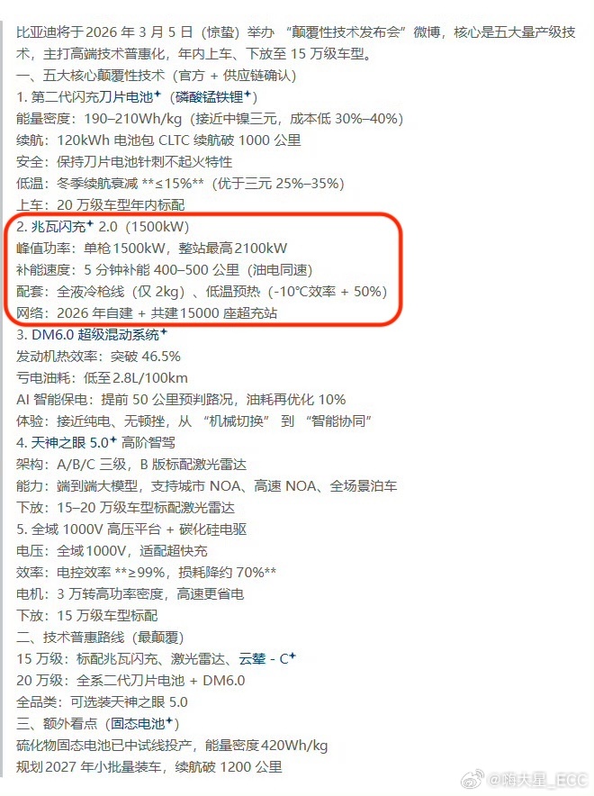 比亚迪此次同时发布「二代刀片电池」和「闪充」,如果单枪功率1500kW、整站峰值2100kW、5 分钟补能400–500km属实,这算是行业顶尖水平吗?比亚迪将召开颠覆性技术发布会 方程豹闪充车型来了