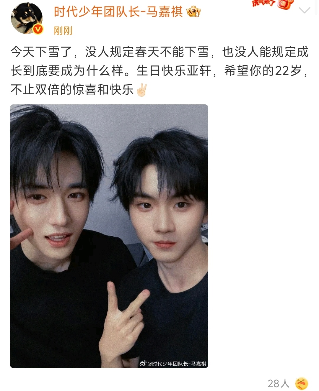 马嘉祺给宋亚轩22岁的生日祝福马嘉祺祝福22岁的宋亚轩 马嘉祺祝福22岁的宋亚轩:希望你的22岁,不止双倍的惊喜和快乐✌🏻