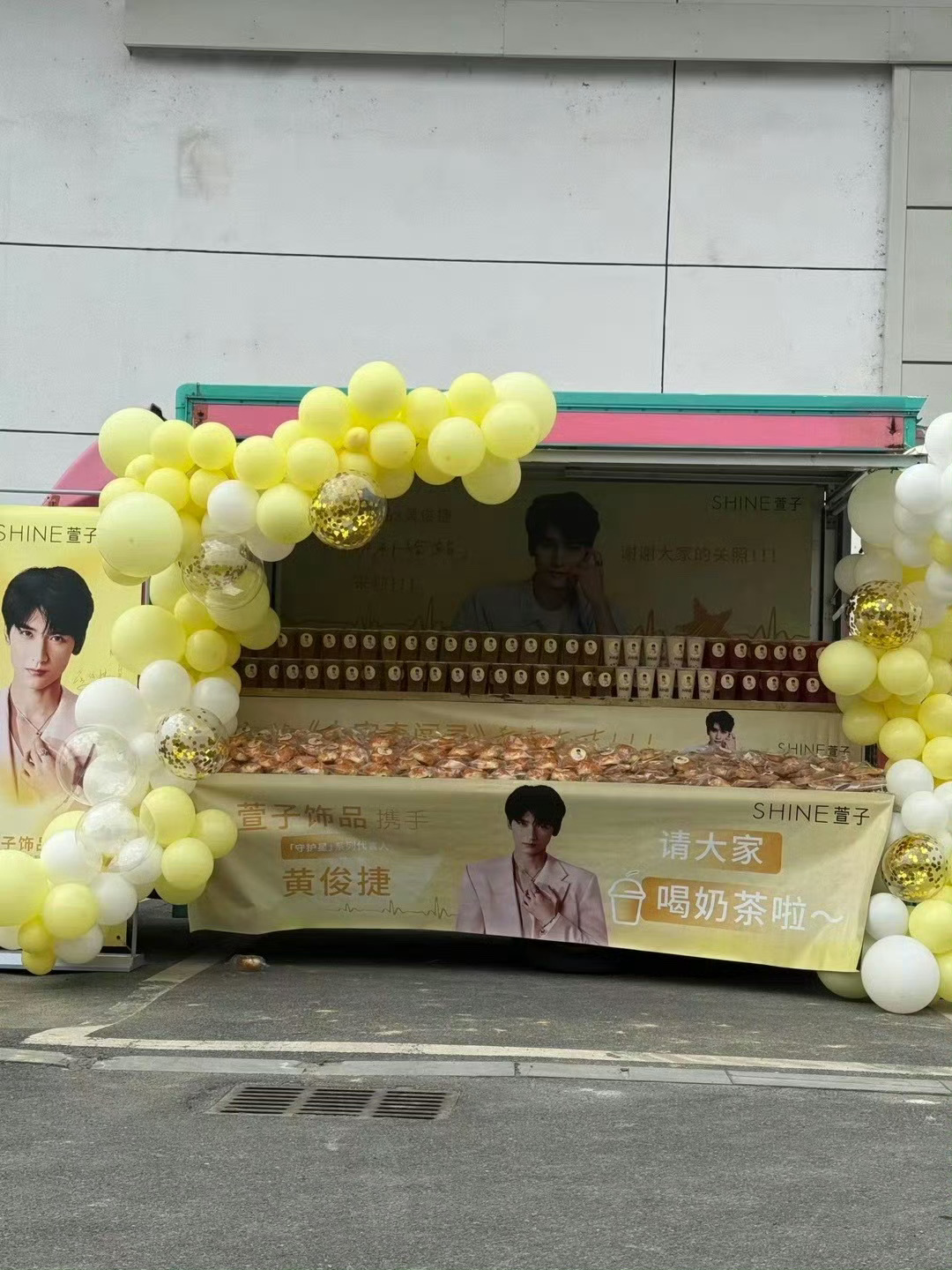 黄俊捷代言的品牌萱子饰品探班《大宋奇闻录》剧组,准备了应援小摊,请工作人员喝奶