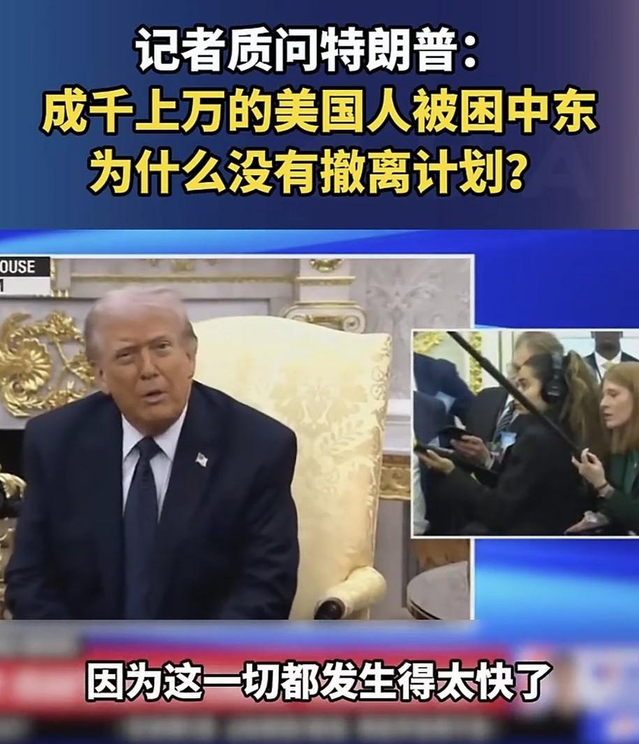 特朗普开始甩锅了。面对记者追问“成千上万美国人滞留在中东,为何没有撤离计划”,特朗普称,一切发生得太快了,当时我认为我们会遭受攻击,他们会攻击以色列和其他国家,这可以去问卢比奥。