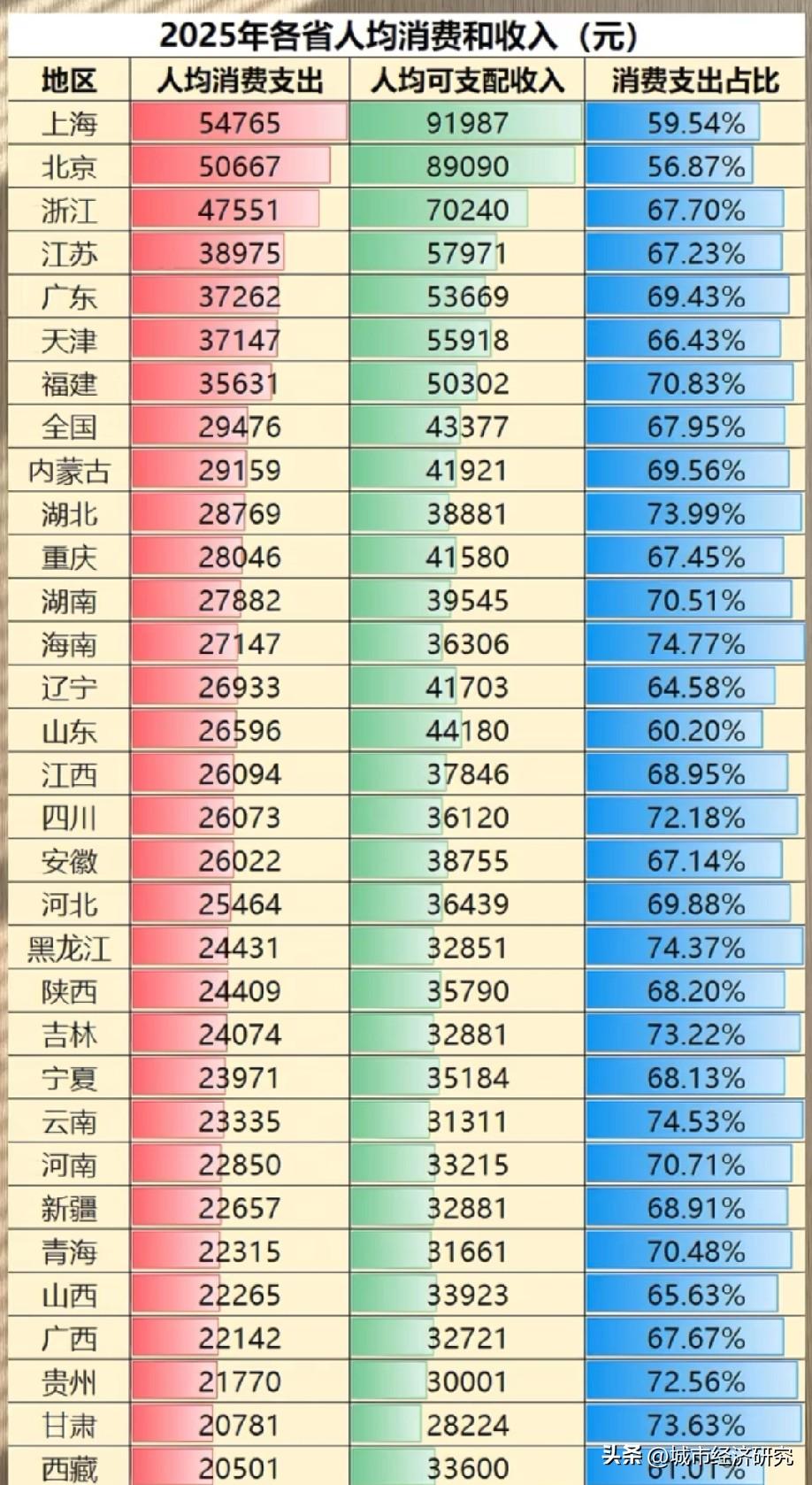 2025年各省市区人均消费支出与人均可支配收入数据水平情况,图片里属于各省市区2025年的人均消费支出以及人均可支配收入数据,网友们可以看看自己所在的省市区2025年的人均消费支出与人均可支配收入数据水平情况怎么样。
