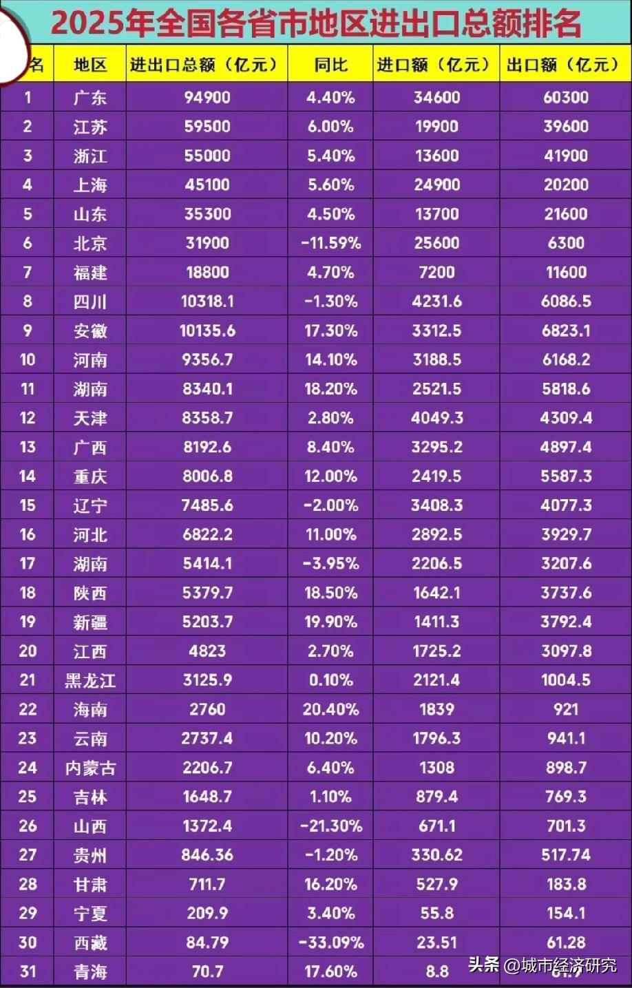 2025年各省市区进出口总额排名情况,图片里属于2025年各省市区进出口总额数据,广东省进出口总额大约以94900亿元人民币左右排名榜一,可见广东属于2025年我国进出口总额排名最高的省份,网友们可以看看自己所在的省市区进出口总额排名情况怎么样。