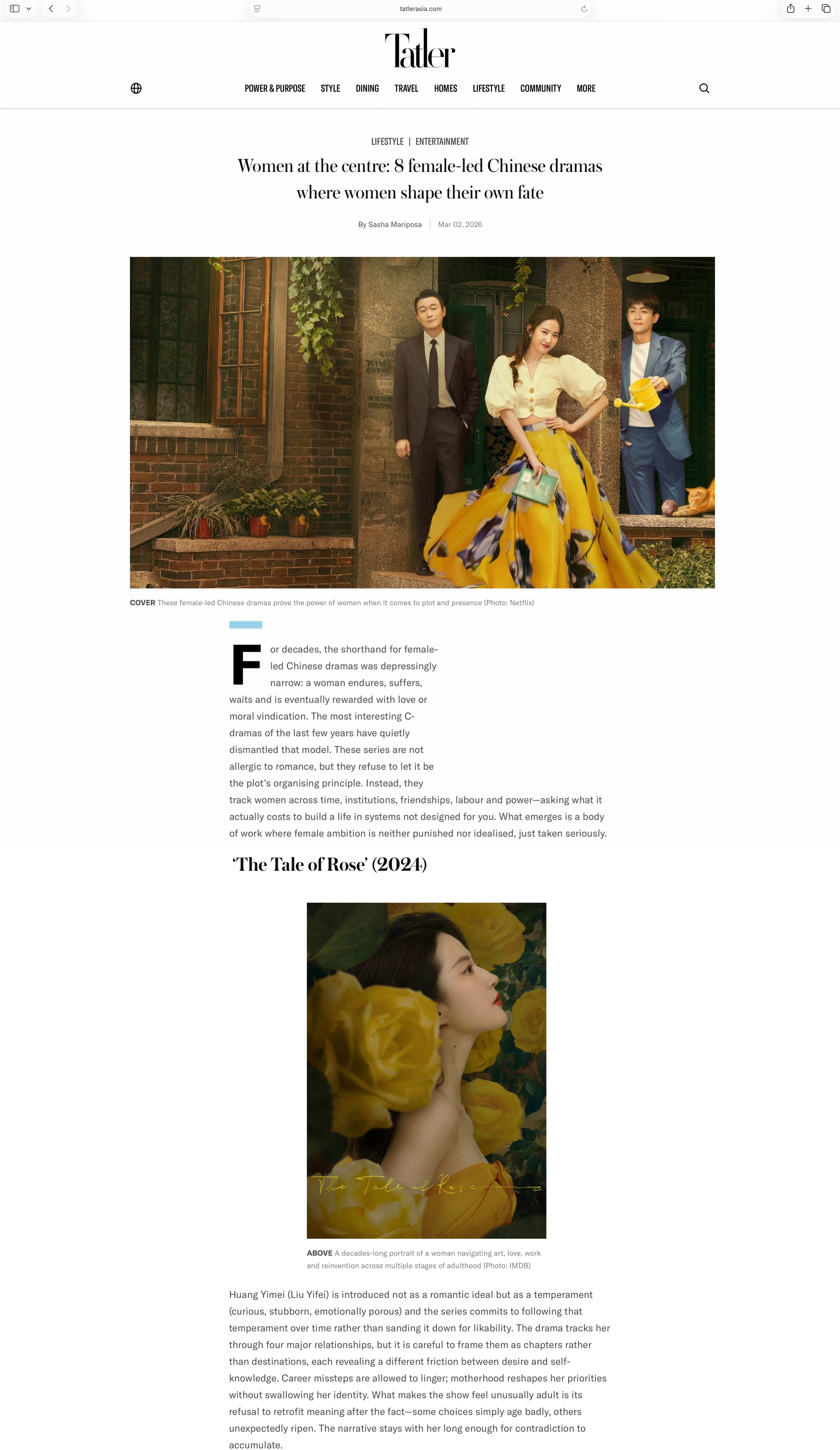 刘亦菲 lyf 刘亦菲玫瑰的故事 Tatler Asia最近的长文专题报道【以女性为中心:由女性主导、女性掌握自己命运的中国电视剧】headline封面图片和首个重点提及是顶级演员刘亦菲的大女主大爆剧《玫瑰的故事》: 在很长一段时间里,“女性主导的中国电视剧”常被简化为一种单一叙事:女性忍耐、承受、等待,最终以爱情或道德上的“回报”作为结局。然而近年的一些优秀作品正在悄然改写这种模式。它们并不排斥爱情,但拒绝让爱情成为叙事的唯一中心。相反,这些剧集把目光投向女性在时间、制度、友谊、劳动与权力结构中的人生轨迹和追问一个更本质的问题:在一个并非为你而设计的世界里,建立自己的人生究竟需要付出怎样的代价。这些由女性叙事驱动的中国剧集证明了女性角色在剧情与存在感上的真正力量。在这样的作品中,女性的野心既不被惩罚,也不被浪漫化,而是被当作一种真实而复杂的人生动力被呈现。 刘亦菲主演的《玫瑰的故事》正是其中的代表作品,这是一幅跨越数十年的女性人生肖像。剧集以长达数十年的时间纵深,描摹女性在不同人生阶段的成长轨迹:艺术、爱情与事业彼此交织,在不断的选择与重塑中完成自我黄亦玫(刘亦菲 饰)登场时,并不是被塑造为某种理想化的浪漫女性形象,而是一种鲜明而复杂的气质:好奇、倔强、情感丰沛。叙事选择忠实地跟随这种性格在时间中的变化,而非为了迎合观众的“可爱度”去打磨或修饰她。剧中呈现的四段重要关系被视为人生的“章节”,而非终点。每一段关系都折射出欲望与自我认知之间不同的摩擦与碰撞。事业上的失误被允许真实地存在;成为母亲改变了她的人生优先级,却并未吞没她的自我。这部剧最成熟的地方,在于它拒绝在事后为一切选择强行赋予意义-有些决定只是随着时间显得不够明智,而另一些却在岁月中意外生长。叙事给予人物足够长的时间,让矛盾、复杂与成长在她身上慢慢沉淀。从某种意义上说,《玫瑰的故事》讲述的并不仅是爱情,而是一个女性如何在现实结构之中,一步步成为自己。刘亦菲效应