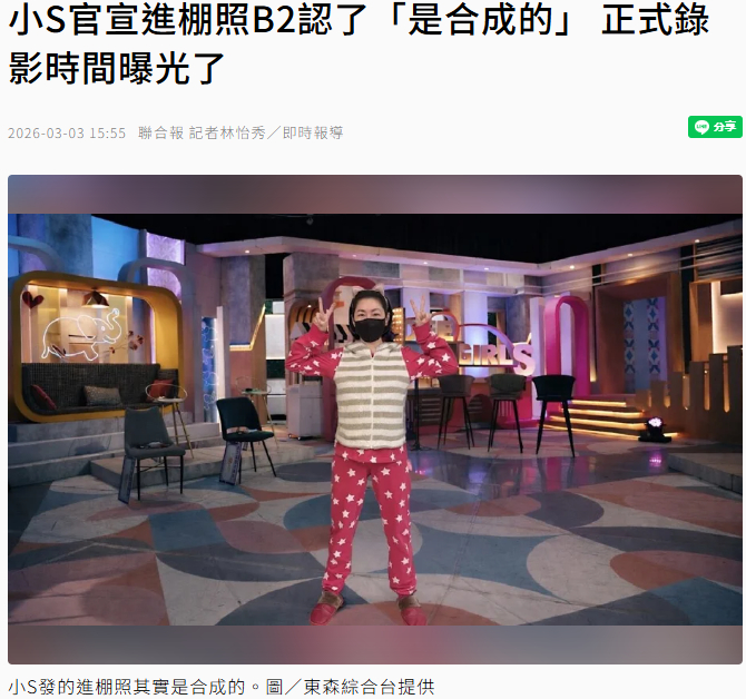 【小S官宣复工进棚照是P的】小S主持小姐不熙娣4月后播出小S(徐熙娣)日前在社媒发了一张身穿睡衣出现在摄影棚的照片,正式宣布复出,即将返回《小姐不熙娣》主持岗位。节目制作人B2接受采访时说,那张照片是合成照。“因为想说还是要搭配一张照片,我们就合成,你们应该看得出来吧?”他坦言小S目前还没进棚开录。至于小S什么时候开始正式录制节目,B2表示:“我们觉得还是一关一关来吧,确定的时间还没有出来,等她准备好。”目前的存档也都还够用,小S主持的集数起码要到4月以后才会播出,在这之前,他就是等小S主动打电话告诉他自己已经准备好。(联合报)