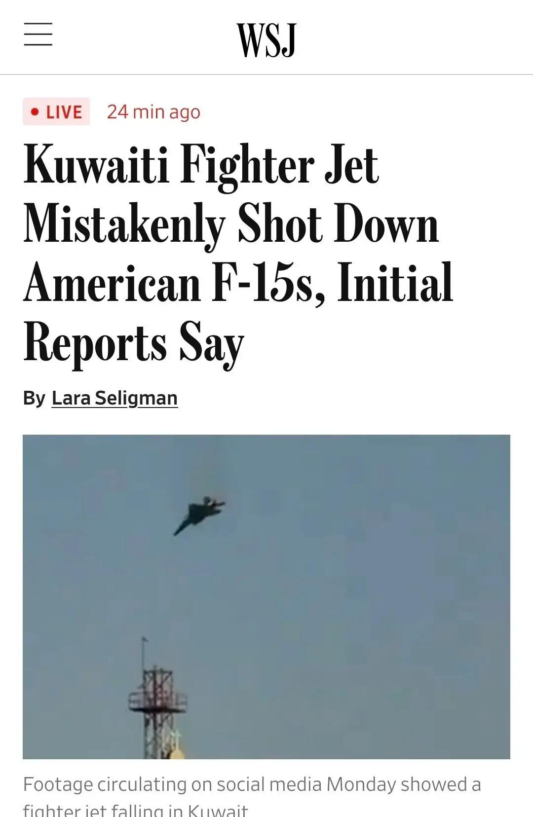 一战封神?科威特飞行员驾驶F-18一己之力击落美军三架F-15 根据美国中央司令部最新的调查结果,前天那三架F-15E战斗机,是被同一架F-18战斗机击落的,这名科威特飞行员,创造了单次战斗3-0的史诗级战绩,可谓一战封神。 击落美国icon3架F-15E的是科威特icon空军1架F/A-18,连续发射3枚AIM-120空对空导弹icon击落3架,创造了现代空战中单次杀伤的最高记录。没想到F/A-18也高光了,就是高光的对象好像不大对。AIM-120的命中率也挺高的,3发3中。 网友,近代最厉害的,自从南斯拉夫以后没有一个人能击落美国飞机,美国佬的宣传策略,既然不能隐瞒被击落,那也不能说是被伊朗击落的,宣传策略而已,F-18E/F不是舰载机吗,科威特有航母?我觉得美国军就是死鸭子嘴硬——死也不肯承认飞机是被伊朗击落的!但美军撒谎也没过脑子,大家不要忘了F18是舰载攻击机!试问科威特没有航母怎么会买F18?F18韩国和日本这些海军强国都没有!