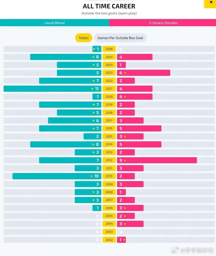 与生俱来的禁区外运动战远射能力,梅西历年禁区外运动战进球数记录